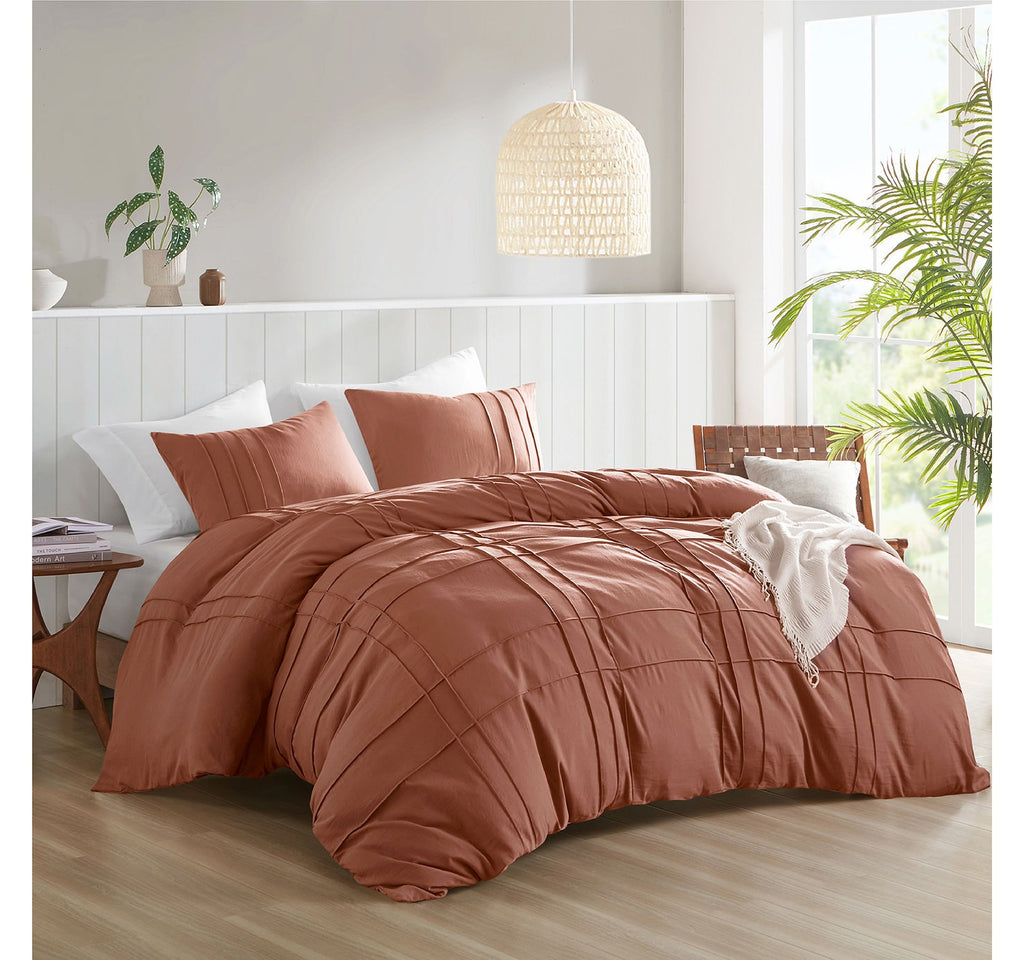 Includes 3 pieces. Featuring a chic grid pattern, our pinch pleat duvet cover set offers a sleek design crafted from soft materials. Made to be breathable for all seasons, the pre-washed microfiber cover has been treated to pamper your skin with extra gentleness, inviting you to unwind and rejuvenate. Due to the premium microfiber fabric and our innovative dyeing technique, this duvet cover set is machine washable, durable, and damage resistant. Rounded off with an oeko-tex safety certification and button closure to keep the filling from shifting, for a refreshing rest. The set includes 1 duvet cover and 2 matching shams (1 sham in twin/twinxl) Displaying a chic design that combines refined pinch pleats with a stylish grid pattern. Crafted from a premium polyester microfiber fabric known for its flexibility and durability. The pre-washed microfiber fabric adds an extra layer of softness and comfort. Designed with 4 inside corner ties and a button closure to keep your duvet insert (not included) secure, preventing any bunching or shifting. Features an overlapping sham enclosure to keep the filling securely in place. Machine washable; follow the care label instructions for easy maintenance. Oeko-tex certified for safety and ensuring gentleness on the skin. # Pieces In Set: 3 Included: 1 Duvet Cover(s), 2 Standard Sham(s) Bedding Closure Type: Button Bed