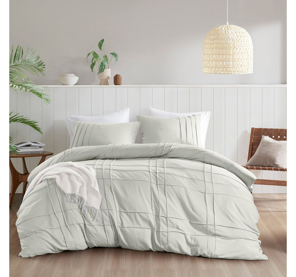 Featuring a chic grid pattern, our pinch pleat duvet cover set offers a sleek design crafted from soft materials. Made to be breathable for all seasons, the pre-washed microfiber cover has been treated to pamper your skin with extra gentleness, inviting you to unwind and rejuvenate. Due to the premium microfiber fabric and our innovative dyeing technique, this duvet cover set is machine washable, durable, and damage resistant. Rounded off with an oeko-tex safety certification and button closure to keep the filling from shifting, for a refreshing rest. The set includes 1 duvet cover and 2 matching shams (1 sham in twin/twinxl) Displaying a chic design that combines refined pinch pleats with a stylish grid pattern. Crafted from a premium polyester microfiber fabric known for its flexibility and durability. The pre-washed microfiber fabric adds an extra layer of softness and comfort. Designed with 4 inside corner ties and a button closure to keep your duvet insert (not included) secure, preventing any bunching or shifting. Features an overlapping sham enclosure to keep the filling securely in place. Machine washable; follow the care label instructions for easy maintenance. Oeko-tex certified for safety and ensuring gentleness on the skin. # Pieces In Set: 3 Included: 1 Duvet Cover(s), 2 Standard Sham(s) Bedding Closure Type: Button Bed