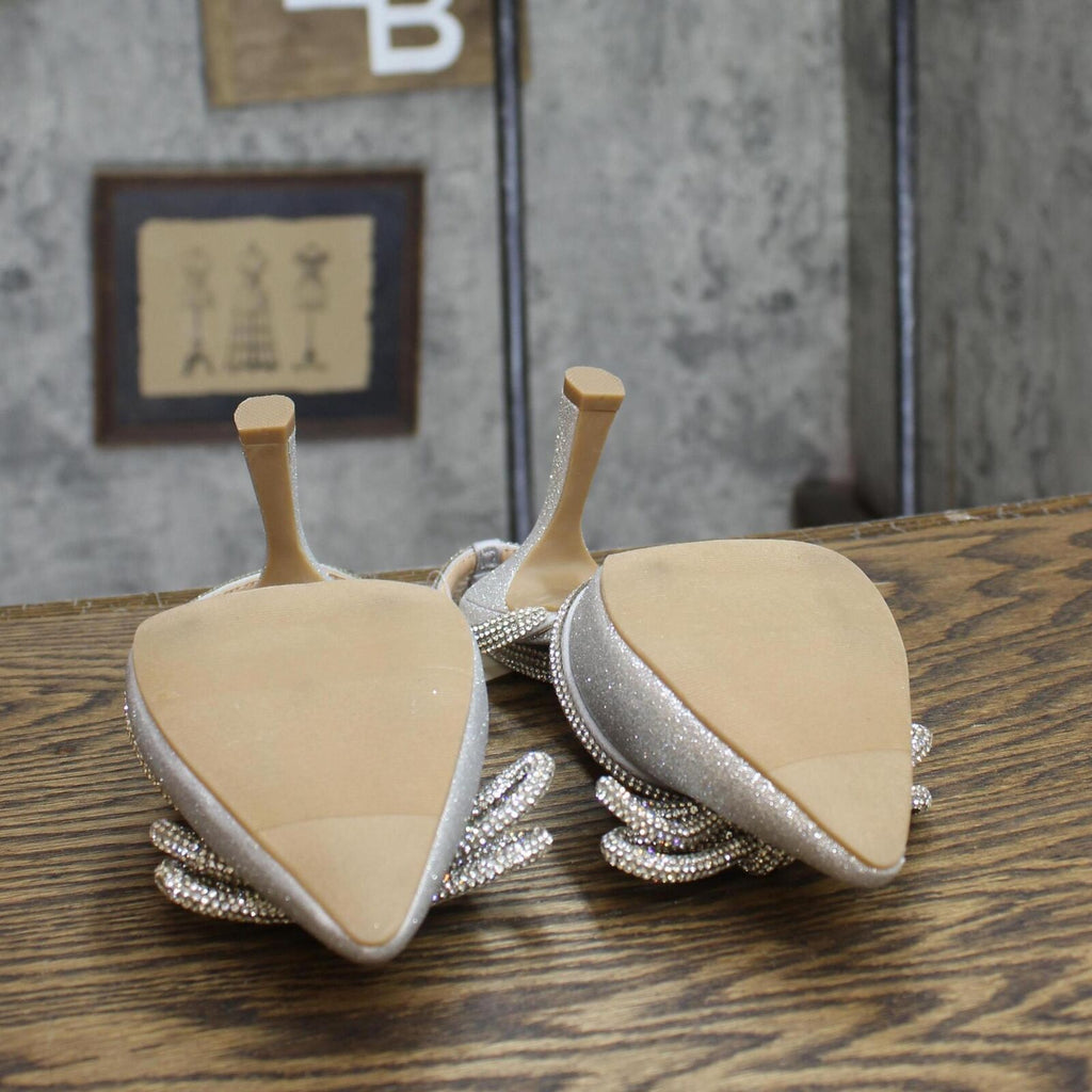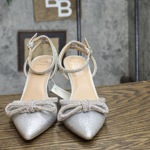 Elevate your special-occasion outfits with these Carmin Bow Pumps from A New Day. These pointed-toe pumps are enhanced by the rhinestone-embellished bow-tie accent on the toe and strap for chic style. The memory foam insole construction makes for comfortable wear, and they're designed with a 3.25-inch stiletto heel to add height to your look. Simply pair them with your dresses or suits to get ready for the day in style.A New Day: Style that goes wherever you do. Carmin bow pumps 3.25in stiletto heel Memory foam insole Pointed toe Adjustable buckle closure Medium width Sizing: Womens Fabric Name: Faux Leather Care and Cleaning: Clean With Mild Detergent Footwear Lining Material: 100% Polyurethane Construction: Memory Foam Insole Footwear Insole Material: 100% Polyurethane Features: Slingback Toe Style: Pointed Toe Footwear Upper Material: 74% Polyurethane and 23% Glass Beads and 3% Zinc Alloy Footwear Outsole Material: 55% Polyester and 45% TPR (Thermoplastic Rubber) Heel: Approximately 3.25 Inches Stiletto Heel Shoe Width: Medium Footwear toe openness: Closed Toe Footwear outsole details: Textured Outsole