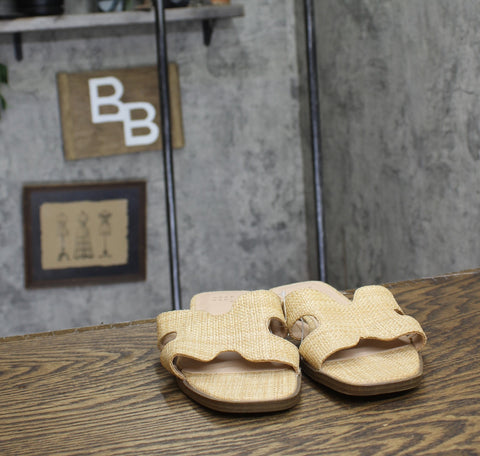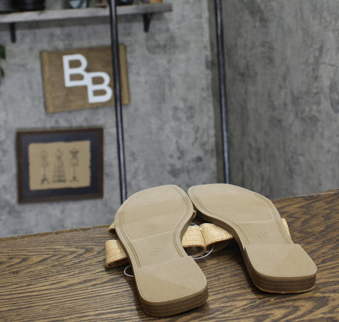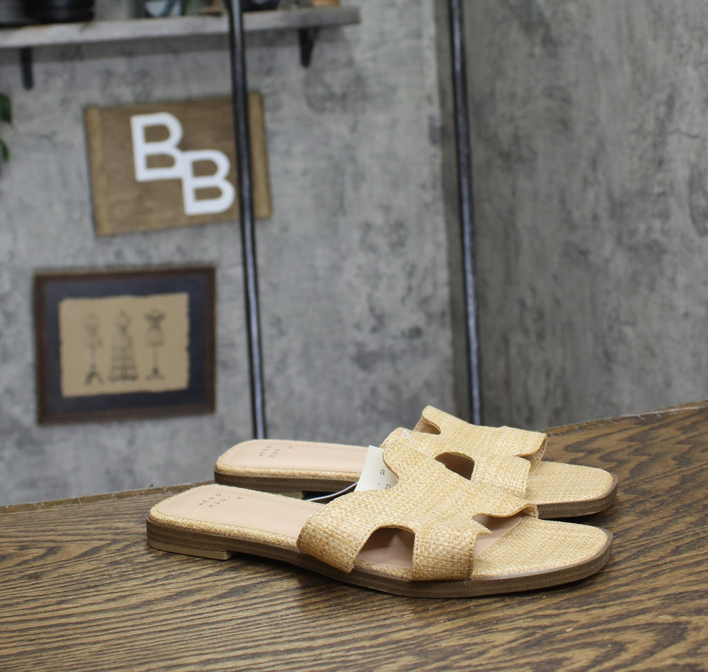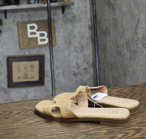 Give your casualwear outfits a stylish finishing touch with these Nina Slide Sandals from A New Day. The slip-on slide sandals feature a breezy open toe and back design that's complete with a stylish top band for a stay-put fit, plus a .25in block heel adds height without compromising on comfort. Pair the sandals with everything from shorts to dresses to create a variety of fun warm-weather ensembles.A New Day: Style that goes wherever you do. Slip-on slide sandals Instep strap construction Open round toe .25in block heel Medium-width Sizing: Womens Construction: Instep Strap Footwear Insole Material: 100% Polyurethane Features: Slip On Care and Cleaning: Clean With Mild Detergent Footwear Lining Material: 100% Polyurethane Toe Style: Round Toe Footwear Upper Material: 100% Raffia Heel: Approximately 0.25 Inches Block Heel Footwear Outsole Material: 58% Polyester and 42% TPR (Thermoplastic Rubber) Shoe Width: Wide Footwear toe openness: Open Toe Footwear outsole details: Textured Outsole