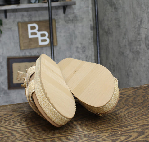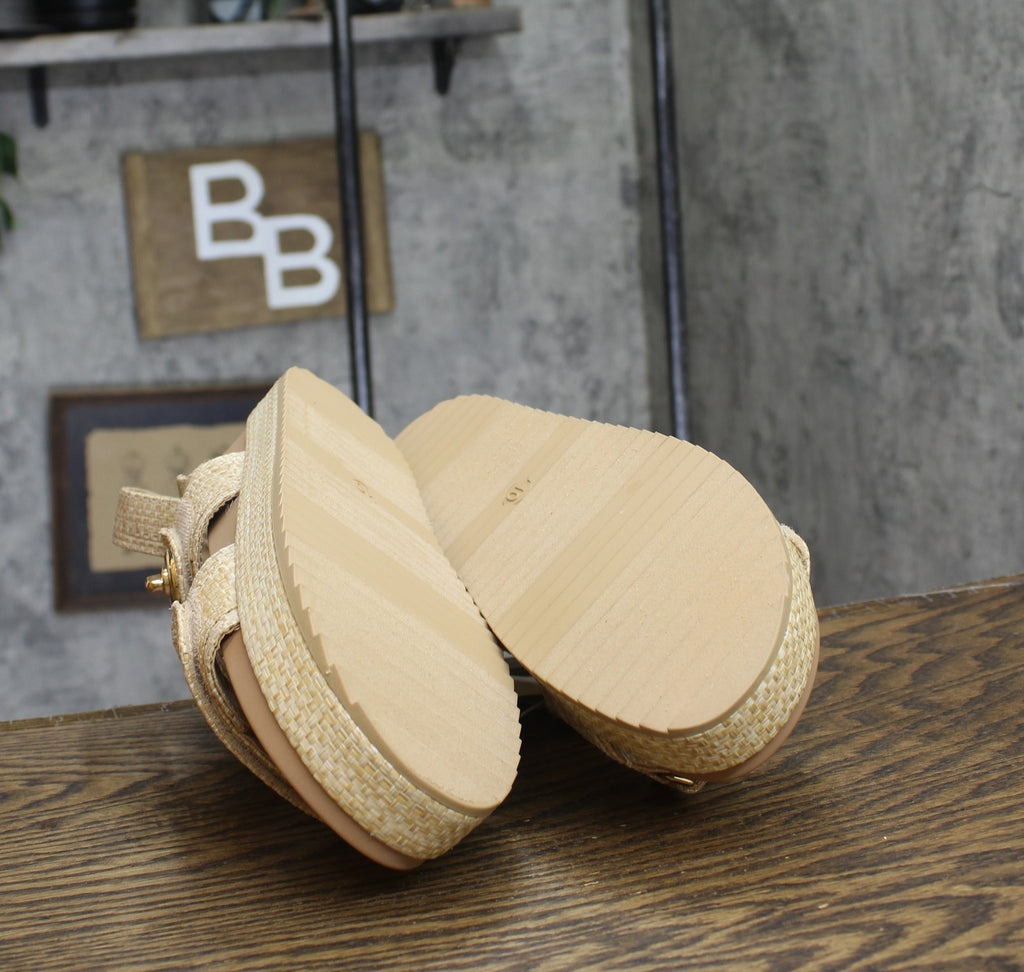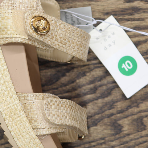 Complement your casual looks with the Tanner Platform Double Band Sandals from A New Day. These platform sandals feature a cushioned footbed with an open toe and approximately two-inch platform heel to help keep your feet comfortable. Designed with a textured outsole, these open-toe sandals have double bands with hook-and-loop closure for a secure fit around the feet.A New Day: Style that goes wherever you do. Open-toe platform sandals Cushioned footbed Approximately 2in platform heel Textured outsole Double bands Hook-and-loop closure Sizing: Womens Care and Cleaning: Clean With Mild Detergent Footwear Lining Material: 100% Polyurethane Construction: Cushioned Footbed Footwear Insole Material: 100% Polyurethane Features: Hook and Loop Closure Toe Style: Round Toe Footwear Upper Material: 95% Raffia and 5% Zinc Alloy Footwear Outsole Material: 55% Polyester and 45% TPR (Thermoplastic Rubber) Heel: Approximately 1.75 Inches Platform Heel Shoe Width: Medium Footwear toe openness: Open Toe Footwear outsole details: Textured Outsole