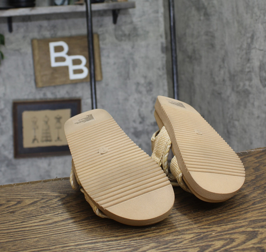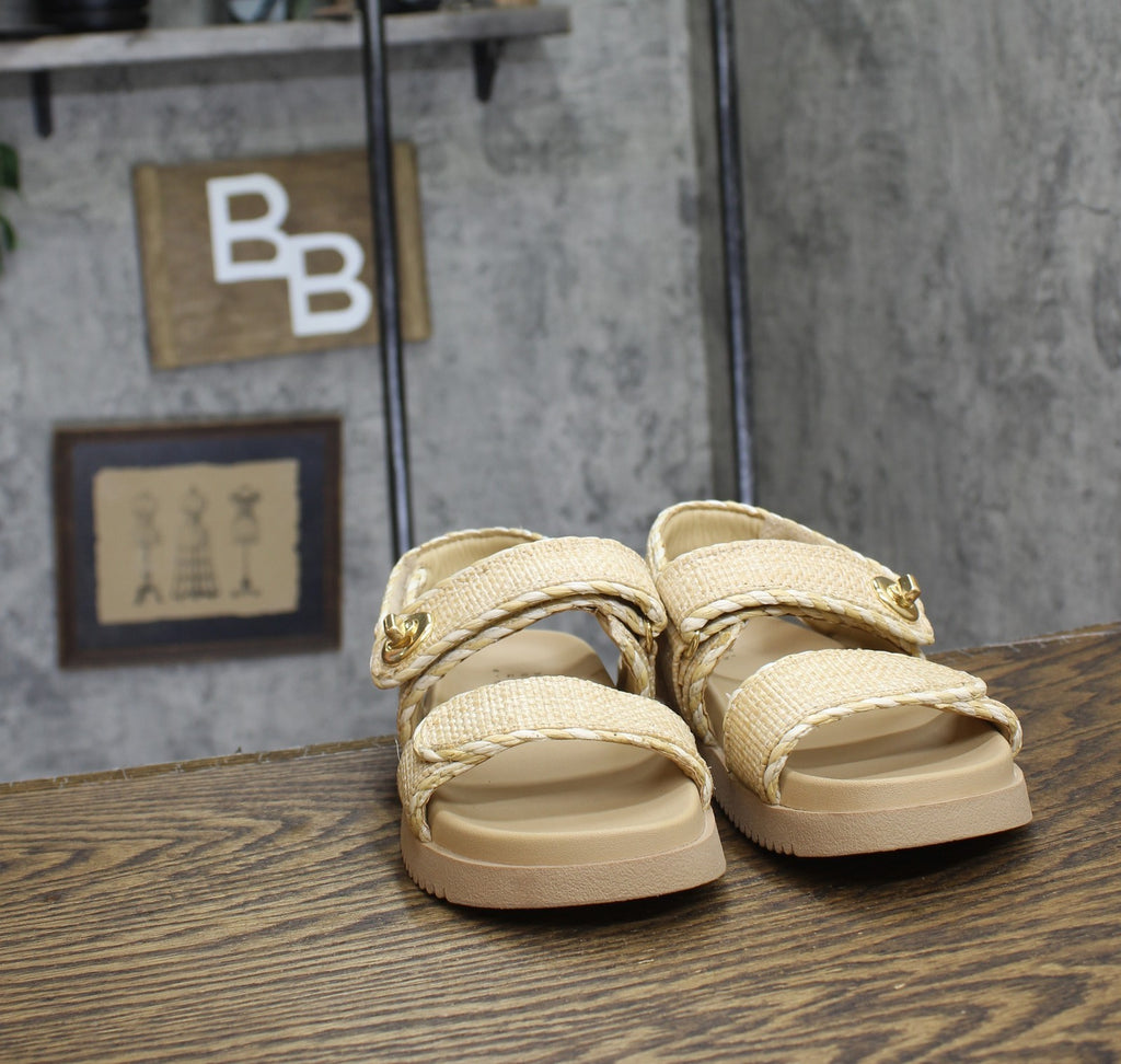 Infuse comfy style into your everyday wardrobe with these Tilly Platform Footbed Sandals from A New Day. These open round-toe sandals with an open-back silhouette are designed with a two-band upper featuring hook-and-loop closures. Set on a textured outsole with a cushioned insole, the platform sandals with shiny metal accents also feature buckled heel straps for an adjustable fit.A New Day: Style that goes wherever you do. Platform footbed sandals with 1.25in heel Cushioned insole 2-band upper with hook-and-loop closure Hook-and-loop heel strap Open round toe and open back Textured outsole Sizing: Womens Care and Cleaning: Clean With Mild Detergent Footwear Lining Material: 100% Polyurethane Construction: Cushioned Insole Footwear Insole Material: 100% Polyurethane Features: Hook and Loop Closure Toe Style: Round Toe Footwear Upper Material: 98% Raffia and 2% Zinc Alloy Footwear Outsole Material: 55% Polyester and 45% TPR (Thermoplastic Rubber) Heel: Approximately 1.25 Inches Platform Heel Shoe Width: Medium Footwear toe openness: Open Toe Footwear outsole details: Textured Outsole