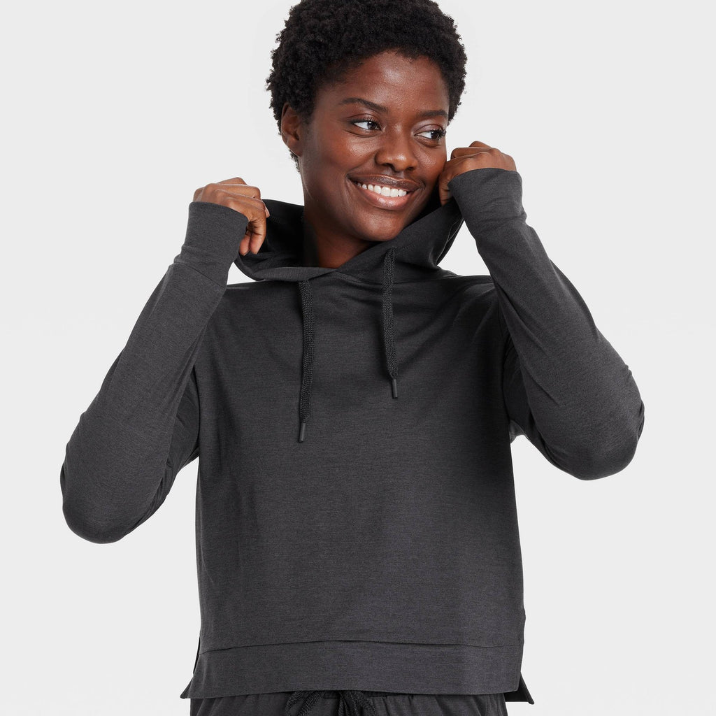 Why we're ALL IN:Comfortable long-sleeve pullover hoodie keeps you performing at your best even in colder conditions. Crafted from extra-lightweight jersey material with stretch for flexibility. Thumbholes in sleeves and drawstring hood are designed for extra protection and coverage. Ribbed hem completes the sporty style. All in Motion: Inspiring the potential in every body. Made for: outdoor activities, exercise, leisure Moves with: extra-lightweight jersey fabric Must-have features: long sleeves with thumbholes, pullover, drawstring hood, ribbed hem Machine wash, tumble dry Sizing: Womens Material: 86% Recycled Polyester, 14% Spandex Hem Style: Ribbed Hem Fit: Regular Fit Fabric Name: Jersey Garment Style: Long Sleeve, Pullover Length: At Hip Neckline: Hooded Garment Details: Drawstring Hood, Thumbholes Fabric Weight Type: Extra Lightweight Care and Cleaning: Machine Wash, Tumble Dry