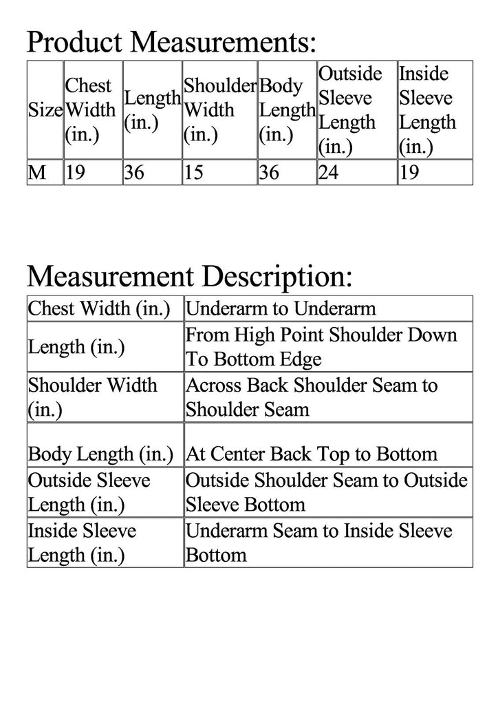 | Size | Chest Width (in.) | Length (in.) | Shoulder Width (in.) | Body Length (in.) | Outside Sleeve Length (in.) | Inside Sleeve Length (in.) |