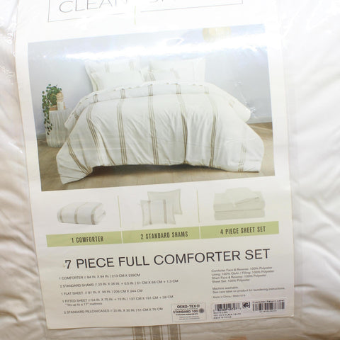 Includes 7 pieces. 1 comforter, 2 shams, 1 fitted sheet, 1 flat sheet, 2 pillowcases. Refresh any bedroom's look and feel with these Clean Spaces comforter sets, featuring over-sized comforters, matching shams and super-soft sheets in a soothing contemporary tones.