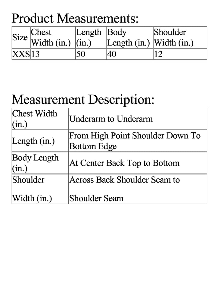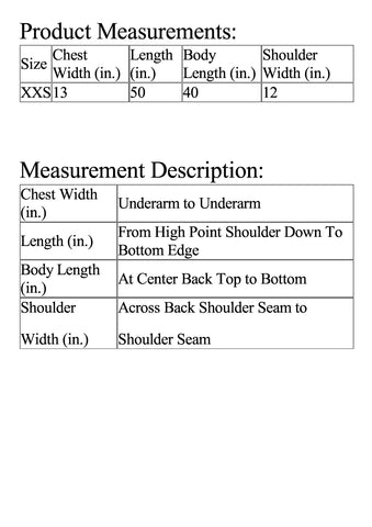 | Size | Chest Width (in.) | Length (in.) | Body Length (in.) | Shoulder Width (in.) |