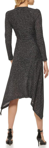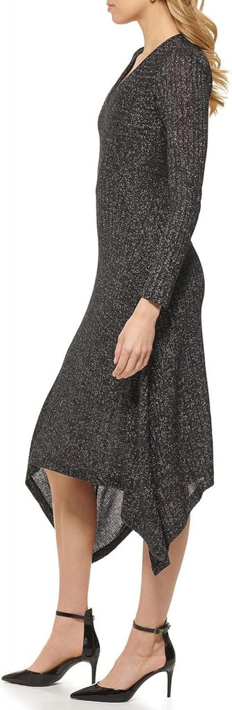 Dance the night away in the ideal partying comfort of the glamorous DKNY Long Sleeve V-Neck Ribbed Dress. Fitted bodice midi-length dress. Made from a sparkly ribbed fabric. V-neckline and long sleeves. Twirl-worthy asymmetric hemline. 86% polyester, 10% Lurex metallic fibers, 4% spandex. Machine wash, dry flat. Made in the USA or Imported. Pull On closure. Dance the night away in the ideal partying comfort of the glamorous DKNY Long Sleeve V-Neck Ribbed Dress. Fitted bodice midi-length dress. Made from a sparkly ribbed fabric. V-neckline and long sleeves. Twirl-worthy asymmetric hemline