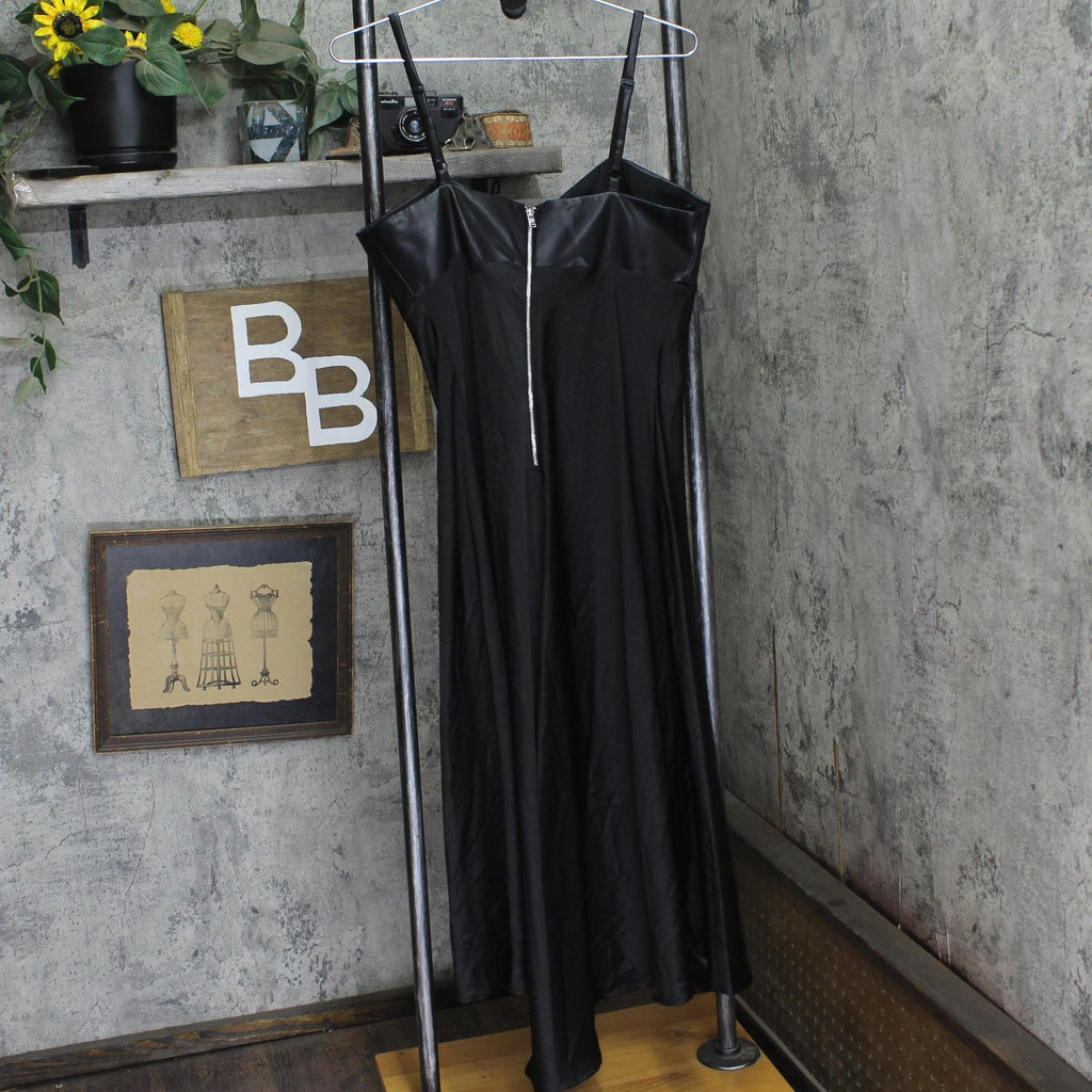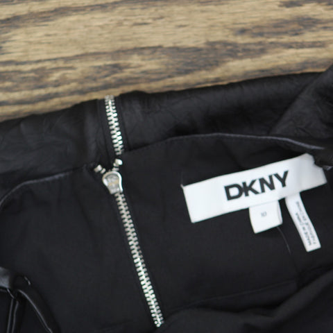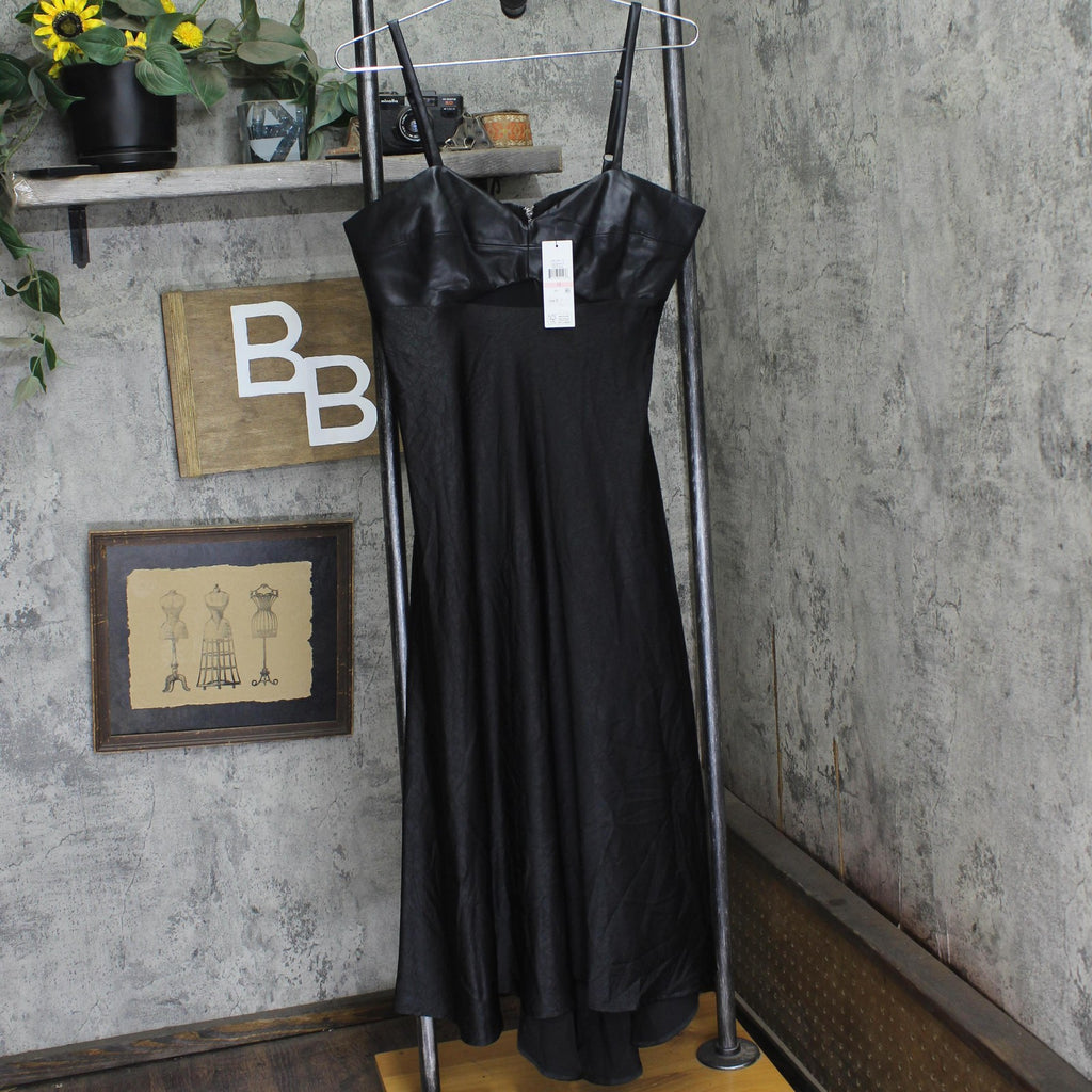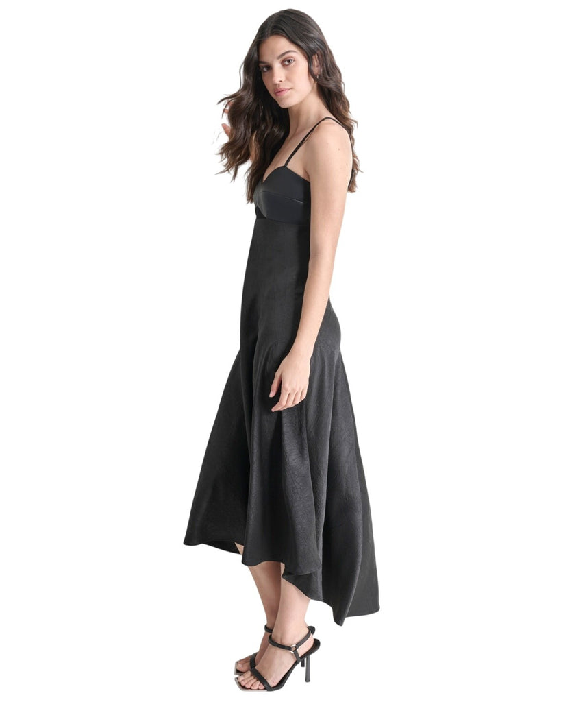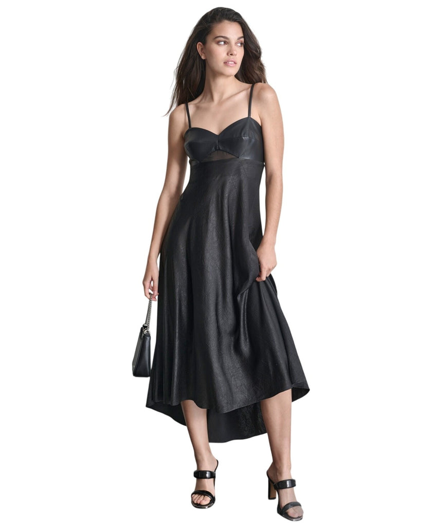 This structured slipdress blends faux leather bodice detailing with a satin-textured skirt. Dkny.