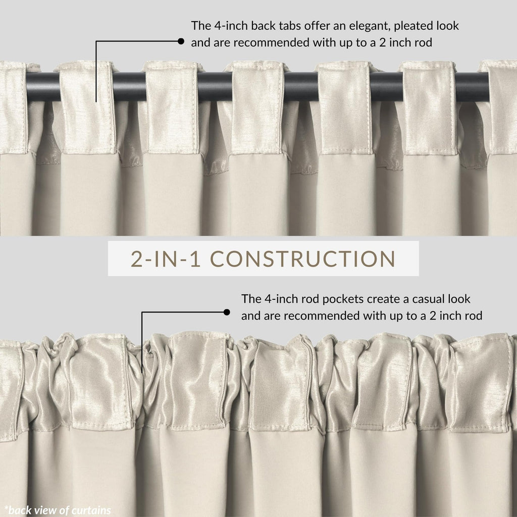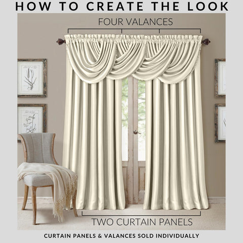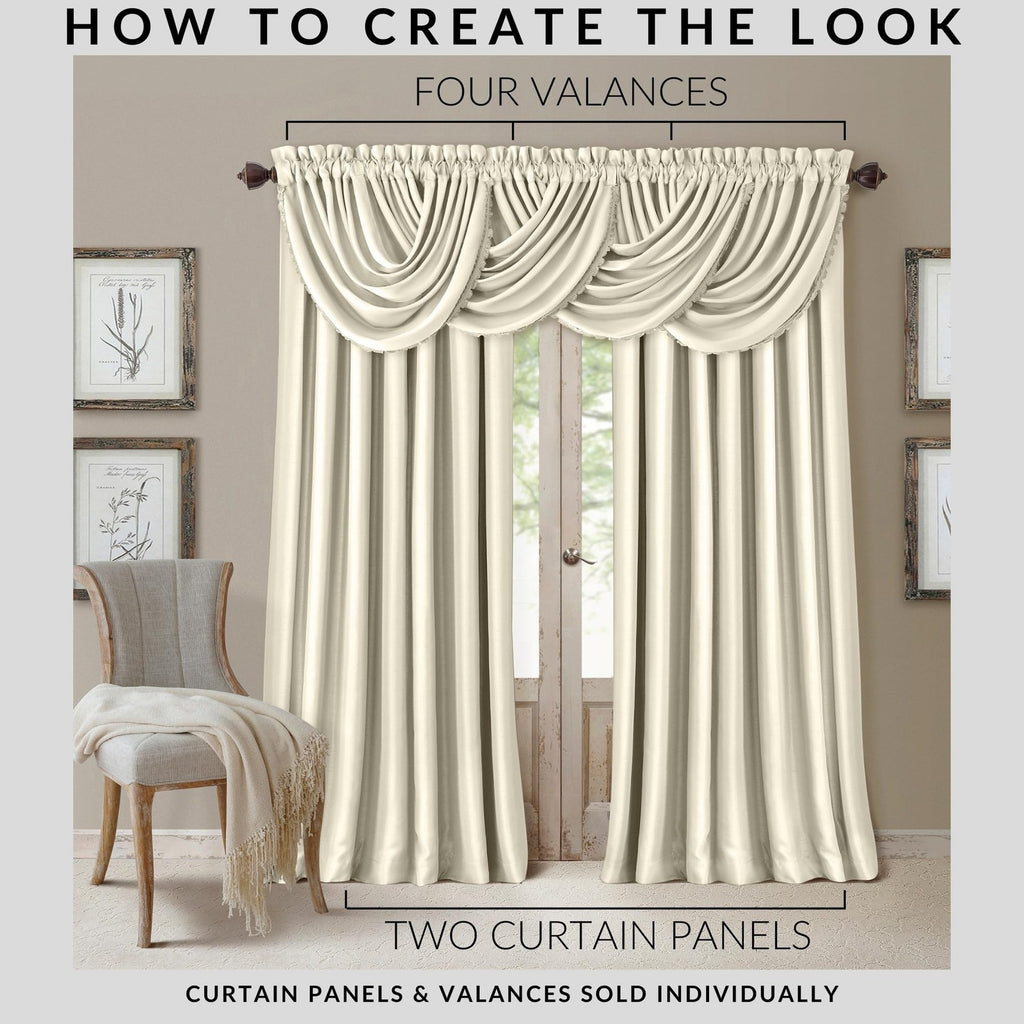 Includes 1 piece. ALL SEASONS ELEGANCE: Elevate your home decor with our luxurious All Seasons faux silk window curtain panel. Crafted from durable polyester, this single panel brings timeless style to any room. Sold as an individual panel measuring 52 inches in width. Offered in two length options: 84 inches and 95 inches long. Each panel comes with a coordinating tie back, allowing you to customize the curtain's look and feel. ROOM DARKENING BENEFITS: Enjoy privacy with the room darkening features of this versatile curtain panel. Opaque fabric blocks out light, noise and helps to insulate windows during cold, winter months. Create a cozy ambiance in bedrooms, living rooms, dining rooms, or any space in your home. DUAL HANGING OPTIONS: Offers a 2-in-1 construction with dual hanging options: Back tabs offer an elegant pleated style while the rod pocket creates a more casual, gathered look. The four inch rod pocket/back tabs are recommended with up to a 2 inch rod for maximum movement. COMPLETE THE LOOK: Enhance your window treatment with our coordinating window valance, sold separately. For a truly stunning look as showcased in our lifestyle image, we recommend using 2 window panels and four waterfall valances. EASY CARE: For quick and easy upkeep of this blackout panel, we recommend a machine wash in cold water on a delicate cycle. Tumble dry on low and use a cool iron as needed to remove stubborn wrinkles.
