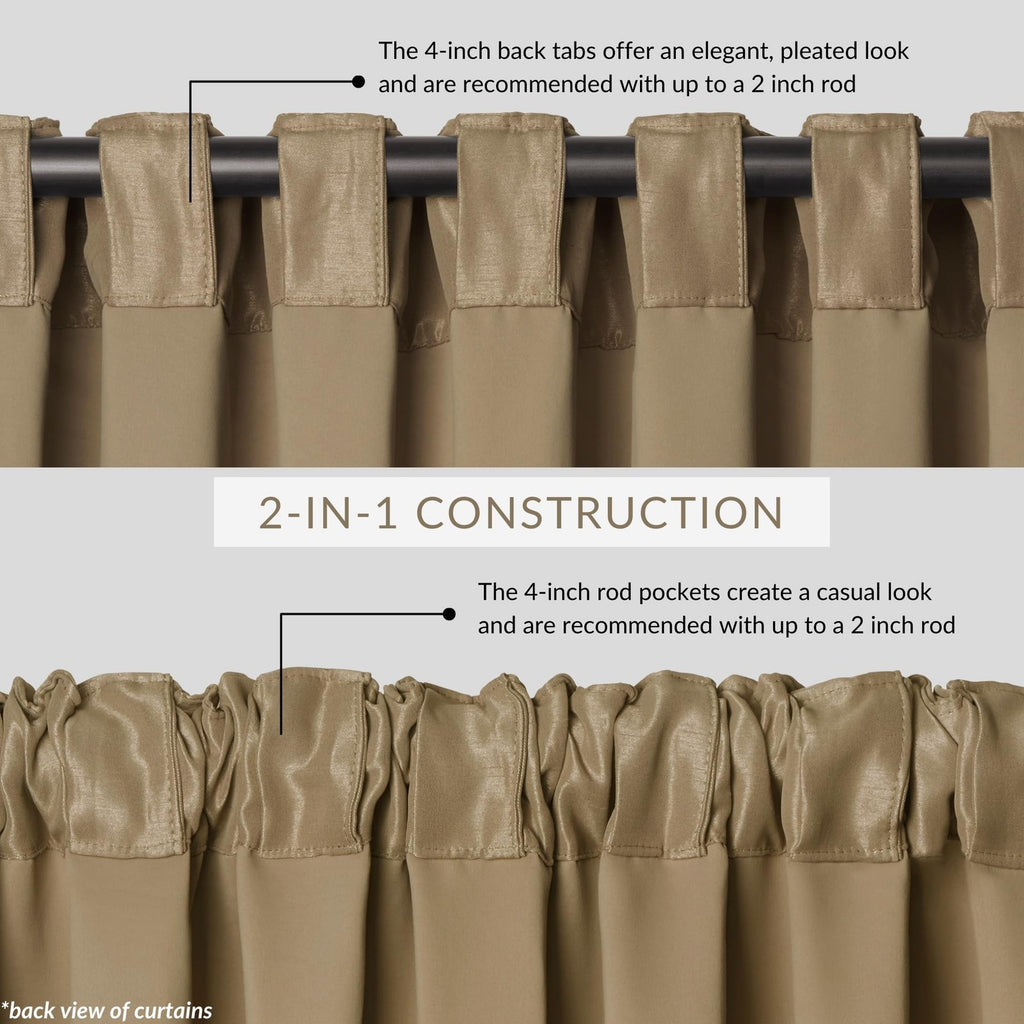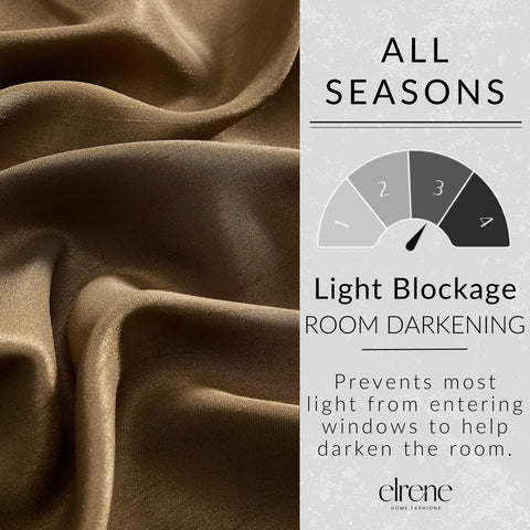 ALL SEASONS ELEGANCE: Elevate your home decor with our luxurious All Seasons faux silk window curtain panel. Crafted from durable polyester, this single panel brings timeless style to any room. Sold as an individual panel measuring 52 inches in width. Offered in two length options: 84 inches and 95 inches long. Each panel comes with a coordinating tie back, allowing you to customize the curtain's look and feel. ROOM DARKENING BENEFITS: Enjoy privacy with the room darkening features of this versatile curtain panel. Opaque fabric blocks out light, noise and helps to insulate windows during cold, winter months. Create a cozy ambiance in bedrooms, living rooms, dining rooms, or any space in your home. DUAL HANGING OPTIONS: Offers a 2-in-1 construction with dual hanging options: Back tabs offer an elegant pleated style while the rod pocket creates a more casual, gathered look. The four inch rod pocket/back tabs are recommended with up to a 2 inch rod for maximum movement. COMPLETE THE LOOK: Enhance your window treatment with our coordinating window valance, sold separately. For a truly stunning look as showcased in our lifestyle image, we recommend using 2 window panels and four waterfall valances. EASY CARE: For quick and easy upkeep of this blackout panel, we recommend a machine wash in cold water on a delicate cycle. Tumble dry on low and use a cool iron as needed to remove stubborn wrinkles.