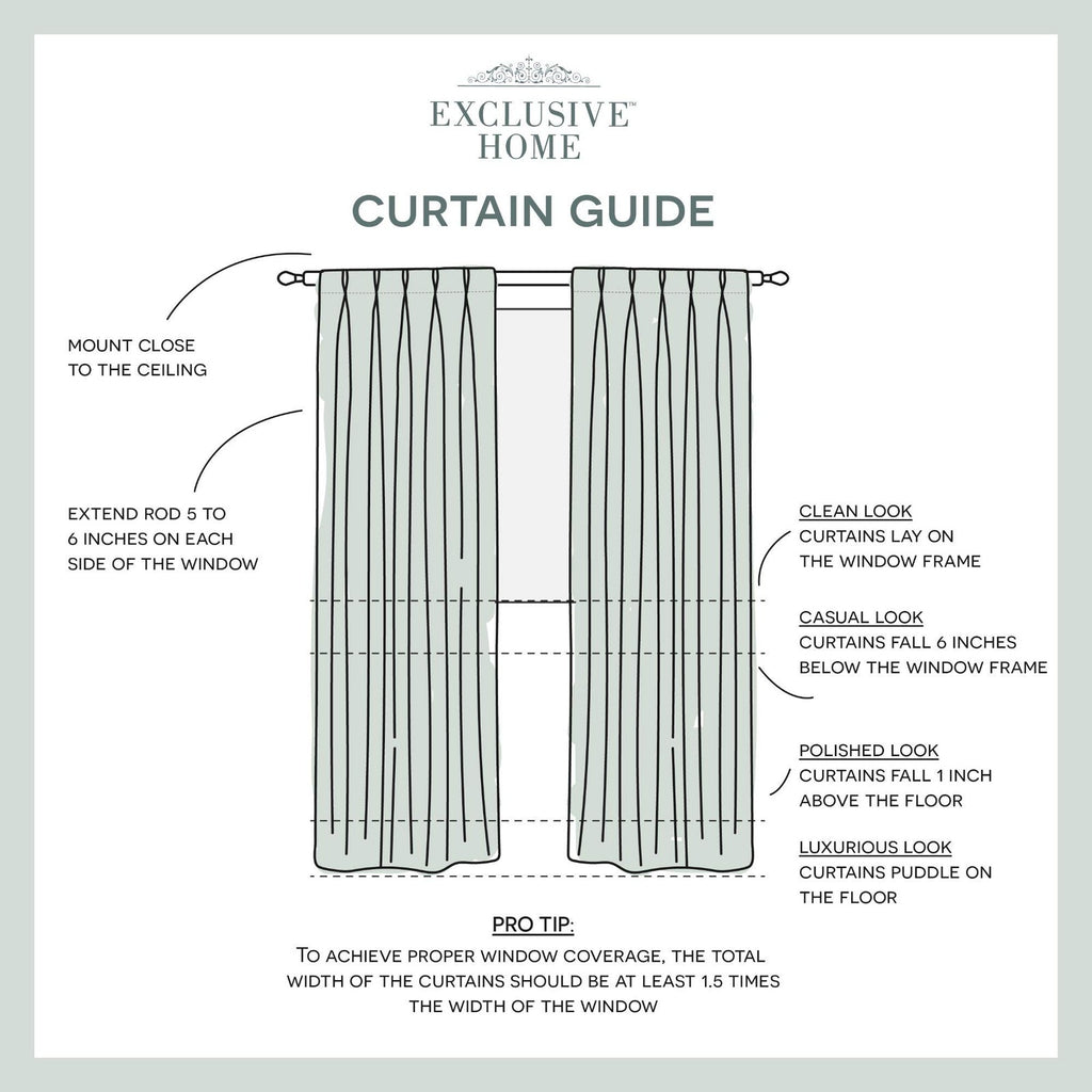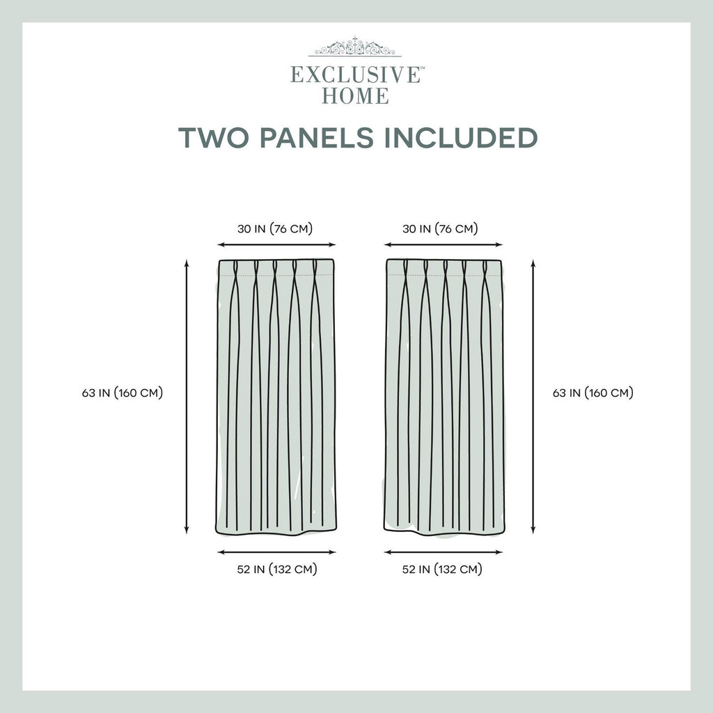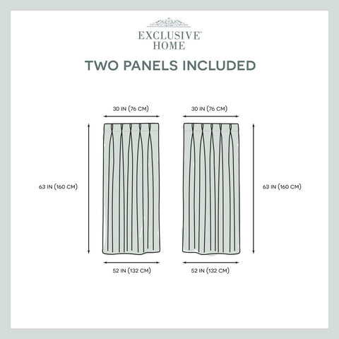 Includes 2 panels. RICH SATEEN: The Exclusive Home Sateen curtain panels are woven in a rich, sateen twill in a neutral linen hue and room darkening blackout opacity. They feature a pinch pleat top and offer a luxuriously elegant look for your windows. ROOM DARKENING OPACITY: room darkening opacity is designed for light control and privacy. HIDDEN TABS FOR HANGING: Hang using the hidden back tabs and your favorite curtain rod and decorative finials. Fits up to 1.5" diameter rod. SET OF TWO CURTAIN PANELS: Includes two (2) curtain panels, each measuring 63" long. 30"W top treatment due to Pinch Pleat design PLACE IN ANY ROOM: These elegant drapes work perfectly in any room. Hang them in your living room, dining room, kitchen, bedroom, or home office. For proper look and fullness, the curtain panels should measure 2-3 times the width of your window/opening.