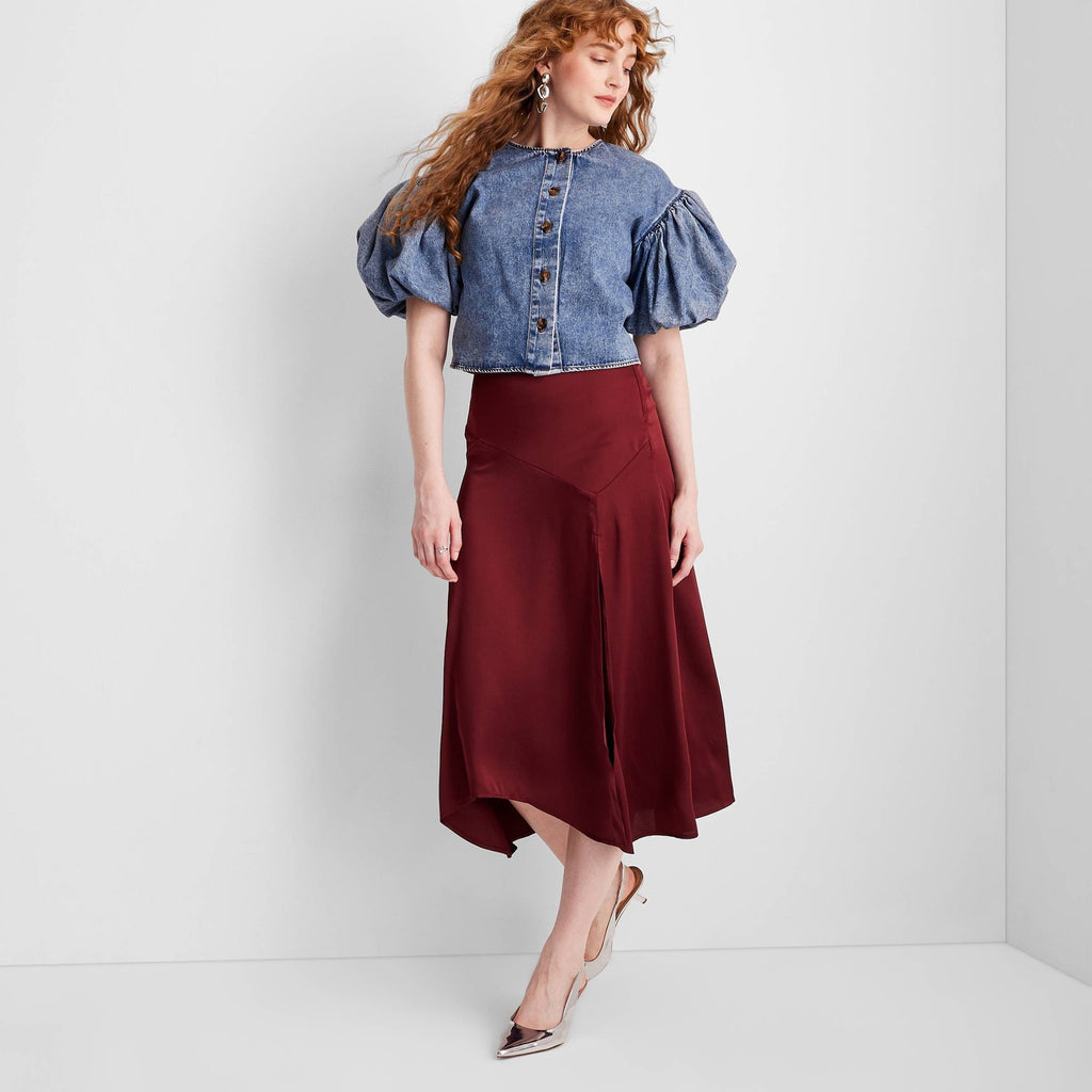 Add a touch of elegance to your holiday wardrobe with the Women's Holiday Flowy Satin Midi Skirt from Future Collective. Made from lightweight polyester fabric, this skirt features a mid-rise fit and a convenient side hook zipper. Its flowy design offers comfort and style, perfect for any festive occasion. Whether you're dressing up for a party or a casual outing, this satin midi skirt is a versatile and chic choice. Enjoy the holidays in style and comfort.Future Collective: Inspired by what’s now to inform what’s next. Women's holiday themed flowy satin skirt Made from durable lightweight woven material Features side hook and zipper details Machine wash and tumble dry for easy care Sizing: Womens Material: 100% Recycled Polyester Garment Length: Midi Closure Style: Side Hook and Zipper Rise: Mid Rise Fit: Regular Fit Fabric Name: Woven Garment Details: No Pocket Fabric Weight Type: Lightweight Fabric Care and Cleaning: Machine Wash, Tumble Dry