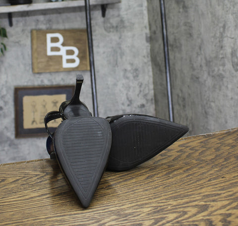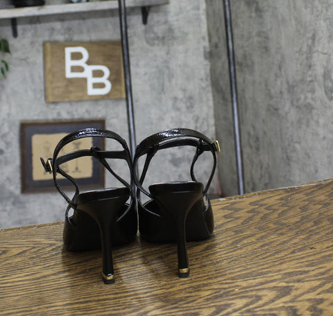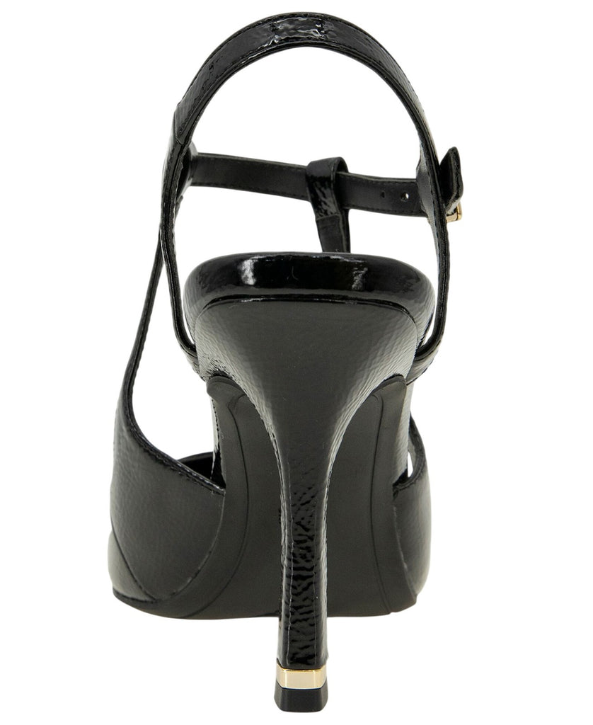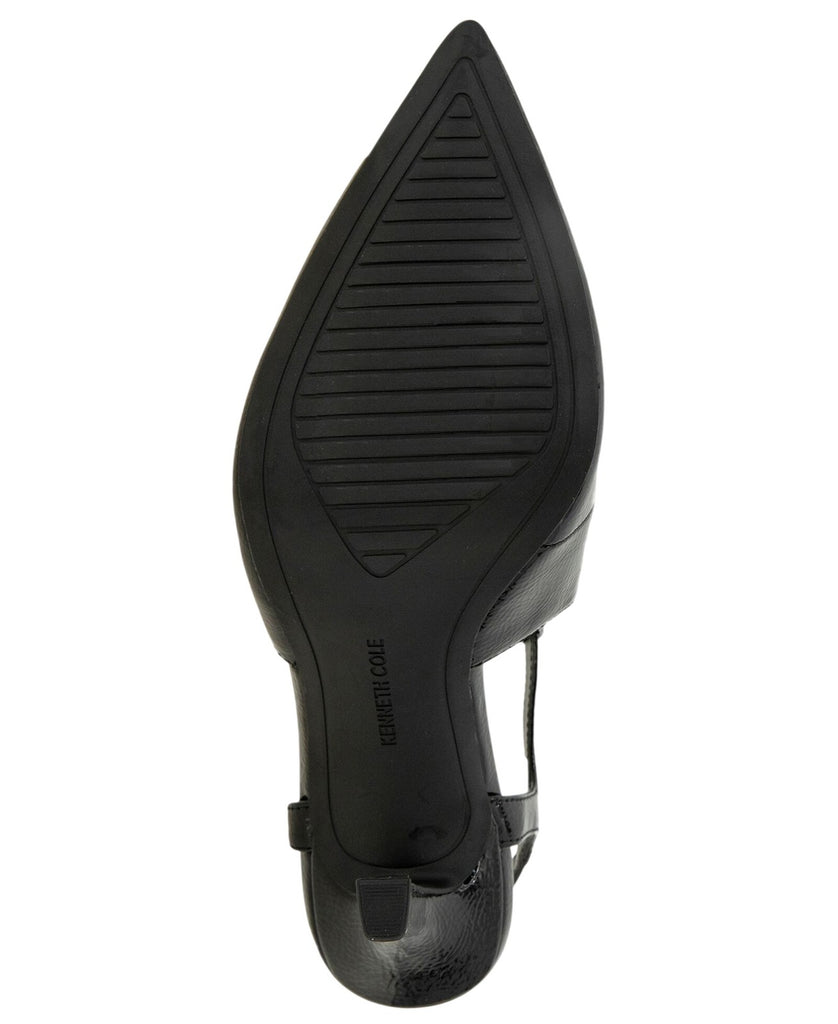 Heel height: 4 inches. Pointed toe pump. Sling back detail. Buckle closure detail.