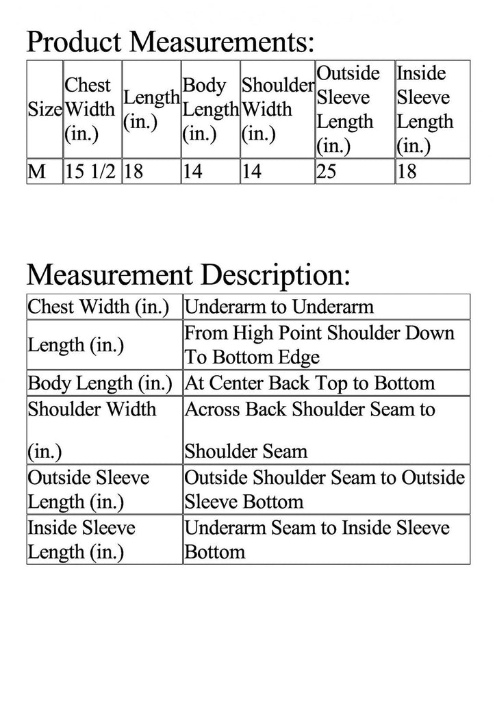 Size Chest Width (in.) Length (in.) Body Length (in.) Shoulder Width (in.) Outside Sleeve Length (in.) Inside Sleeve Length (in.)