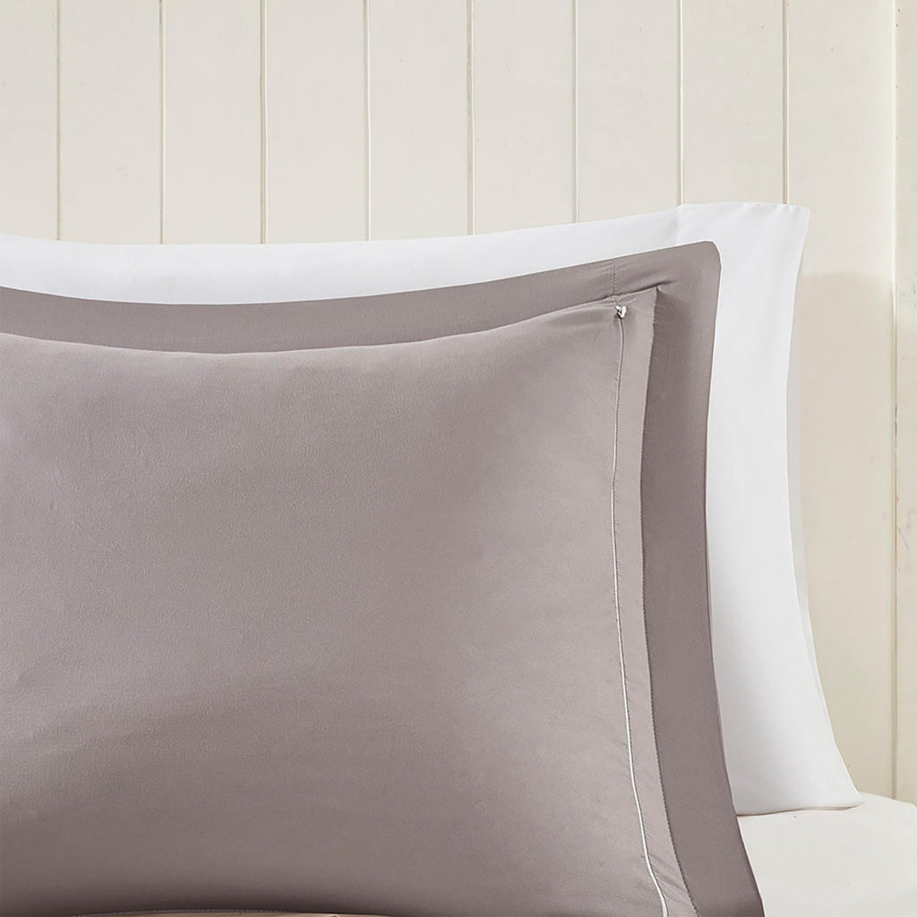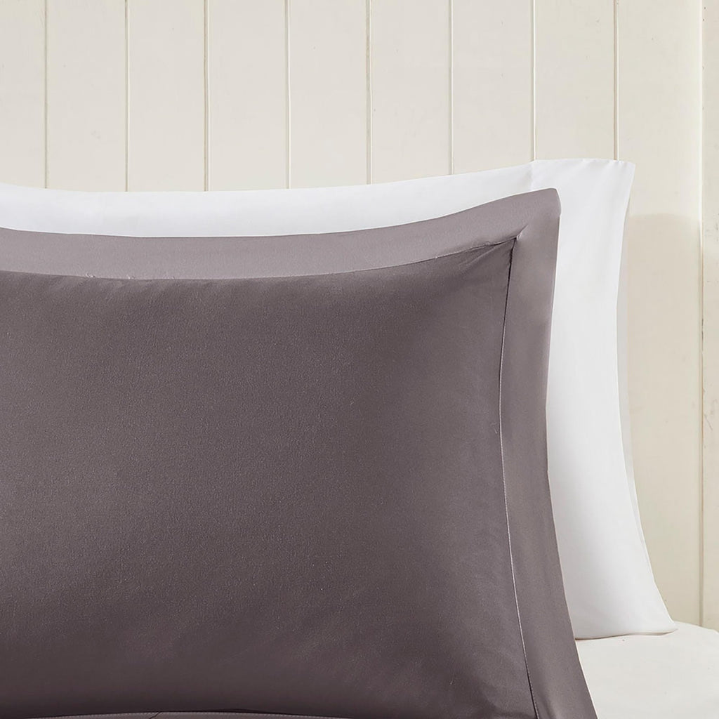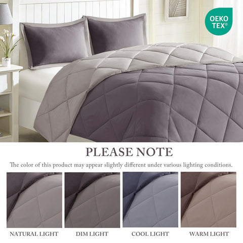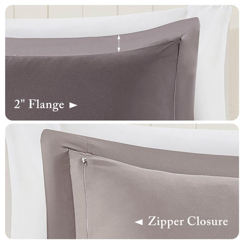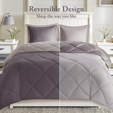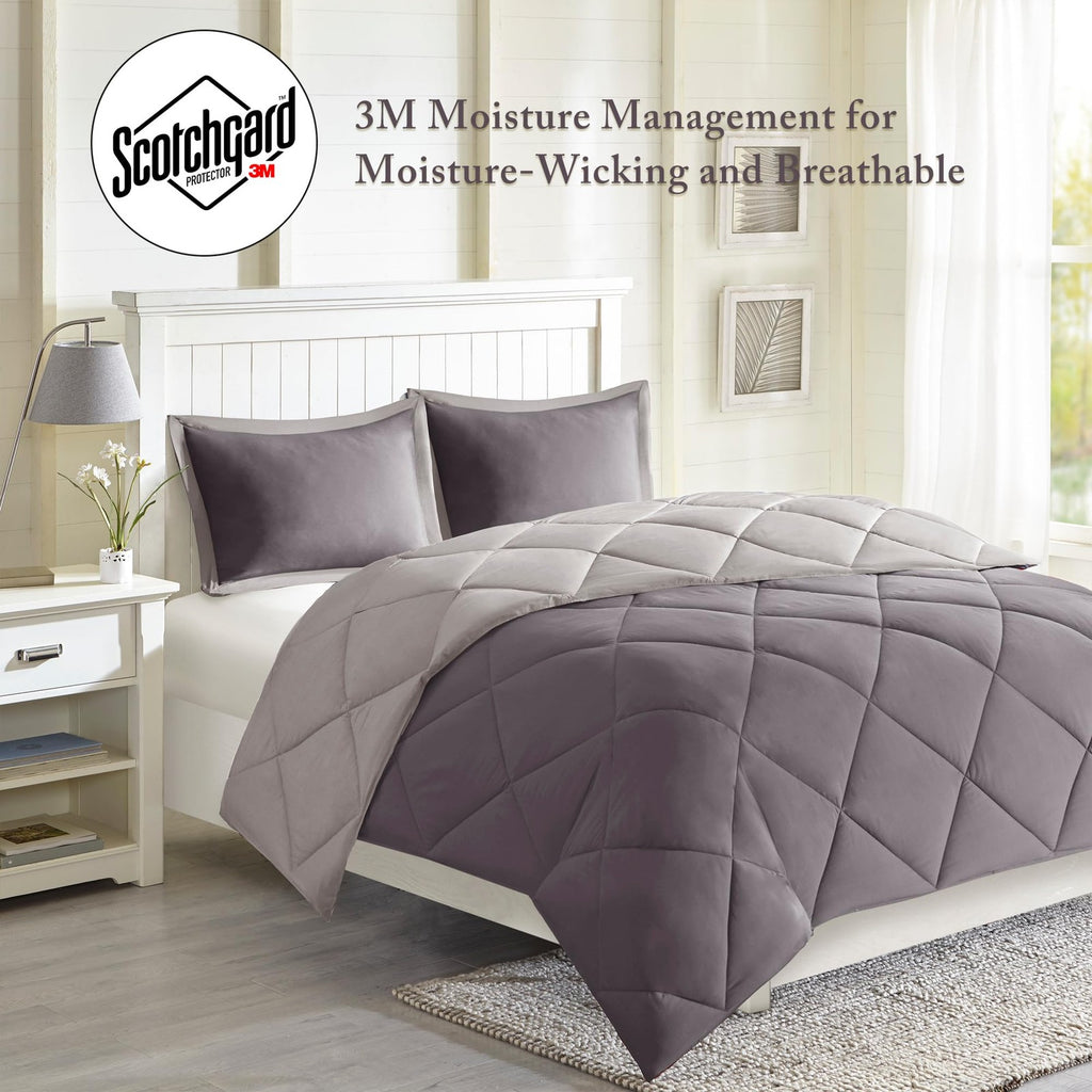 Comforter features 3M Scotchgard Stain Release Hypoallergenic Down alternative fill Duvet cover not required Reversible Diamond Quilting Zipper closure on sham 2" flange on sham Conveniently Set includes: 1 Comforter and 2 Shams (or 1 Sham for Twin sizes) Comforter: 100%polyester microfiber solid for shell, Down Alt filling, sewn thru diamond Sham: 100% Polyester microfiber solid, 2" flange, zipper closure 1 Comforter:86"W x 90"L 2 Standard Shams:20"W x 26"L + 2"D(2) Machine Wash