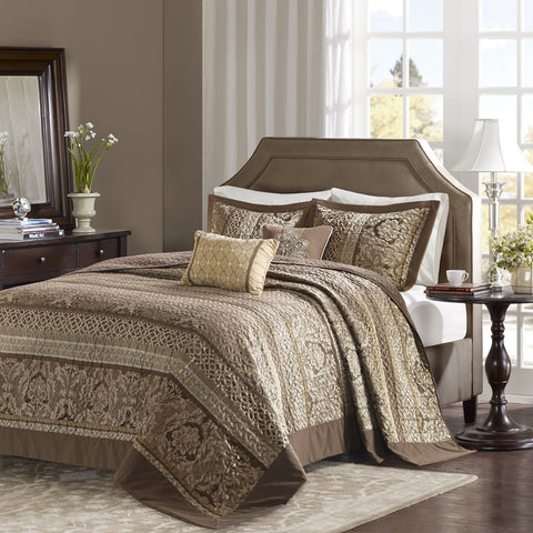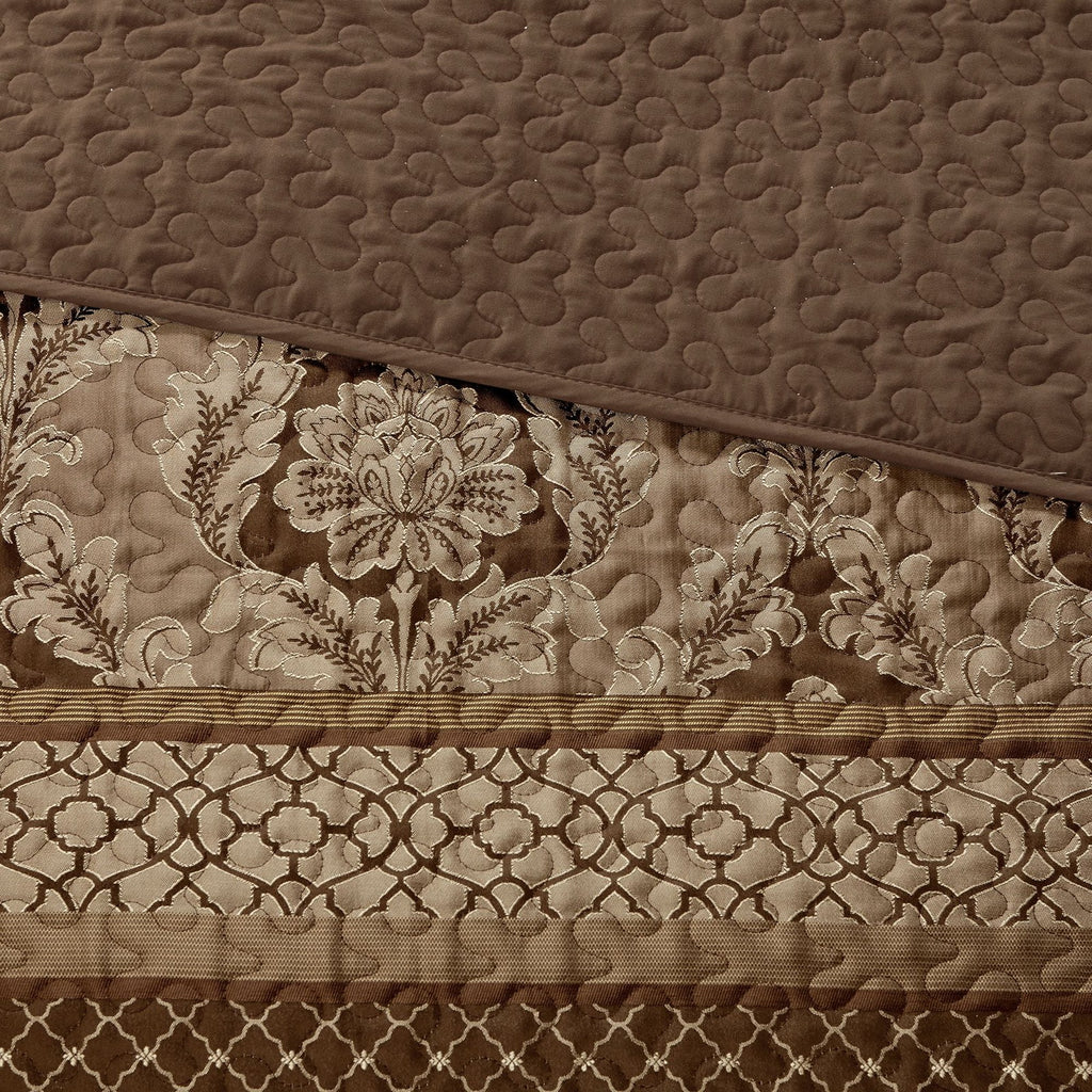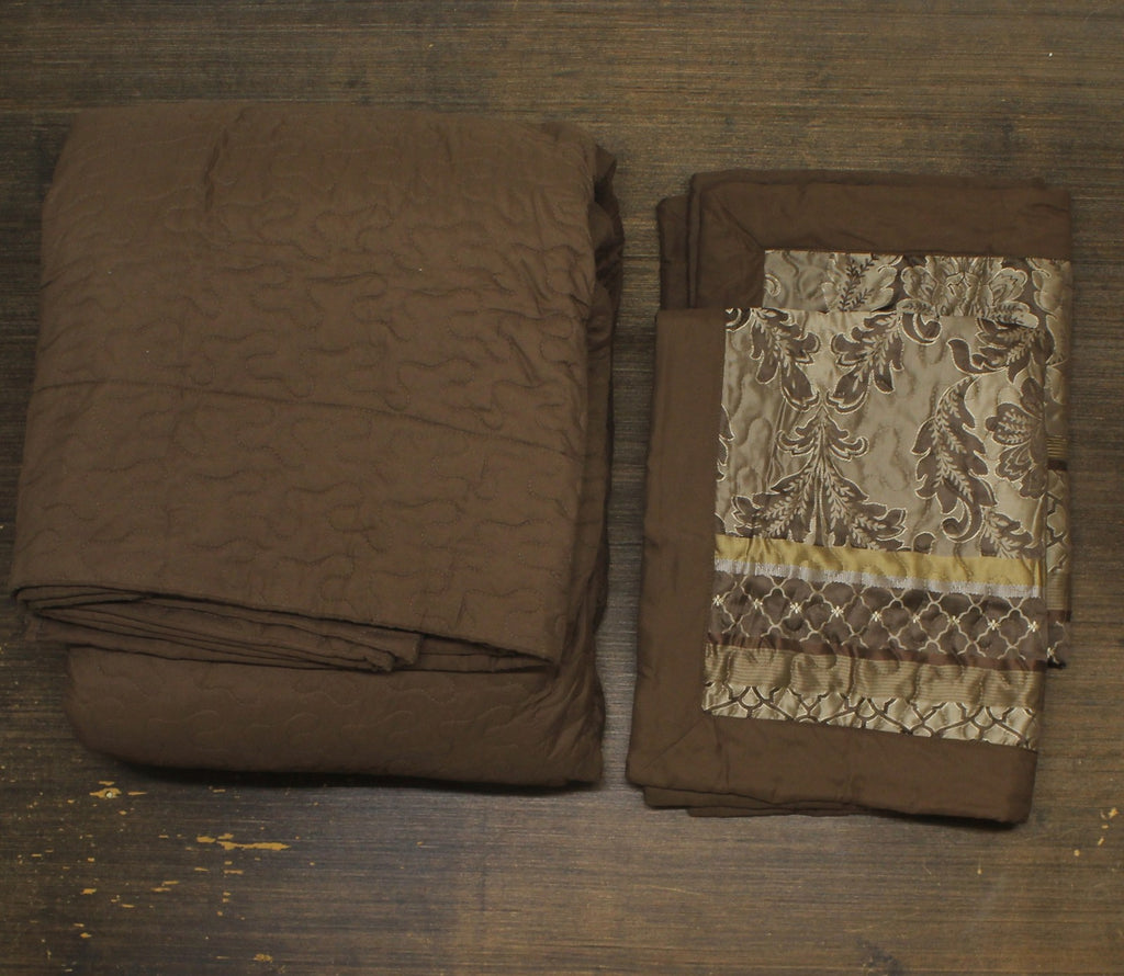 Includes 3 pieces. 1 Bedspread and 2 Shams. Home Essence Mirage 3 Piece Reversible Jacquard Bedspread Set offers a luxurious update to your bedroom decor. Made from quilted polyester jacquard the brown/gold coverlet and shams share leaf woven striping and ironwork motifs that are accentuated by elegant stitching. Flashes of gold are used throughout this collection adding a lavish feeling to your decor. Machine washable for easy care this jacquard bedspread brings an extravagant and traditional touch to your bedroom.