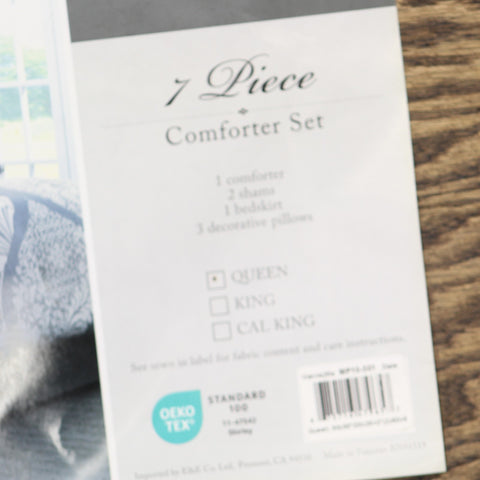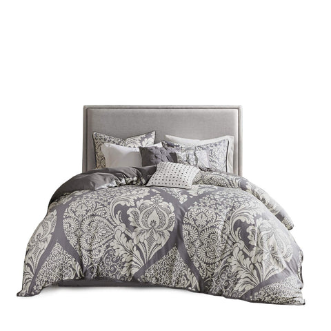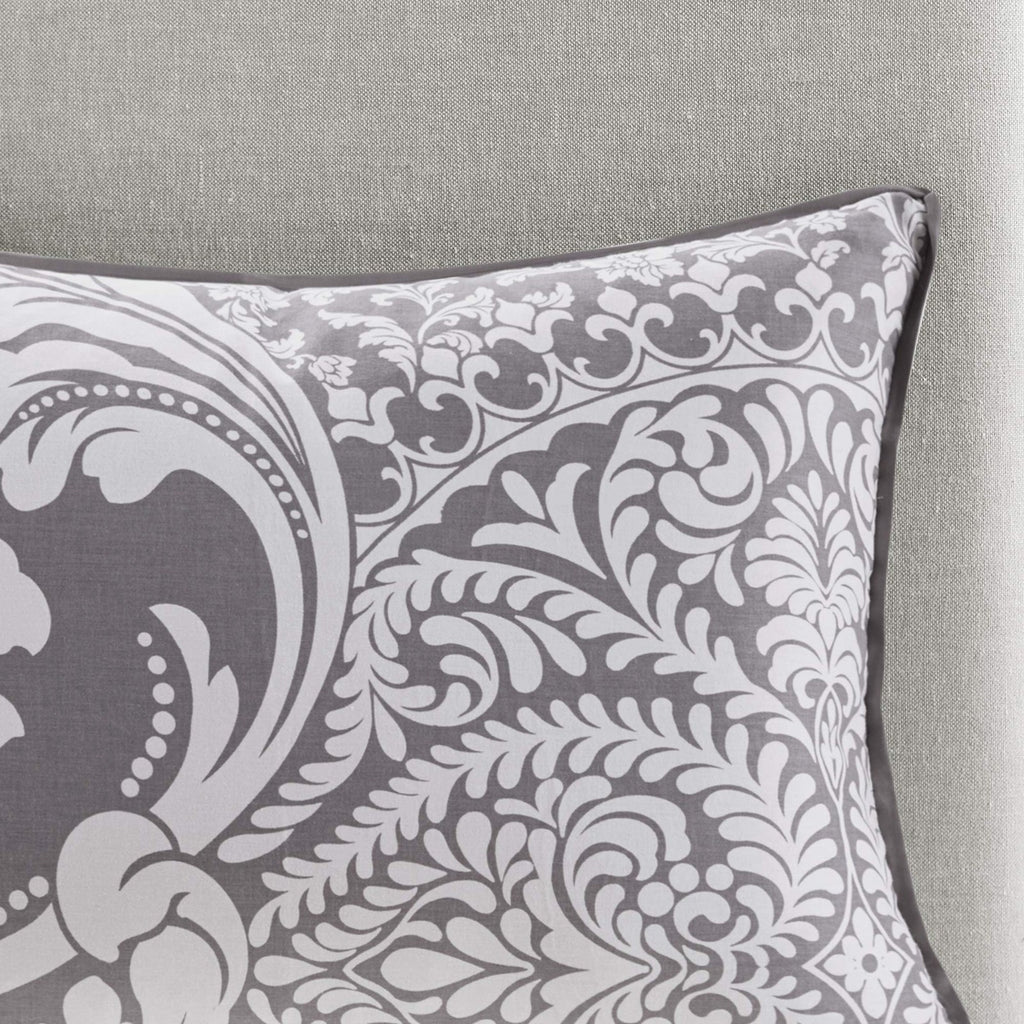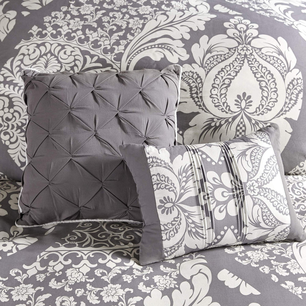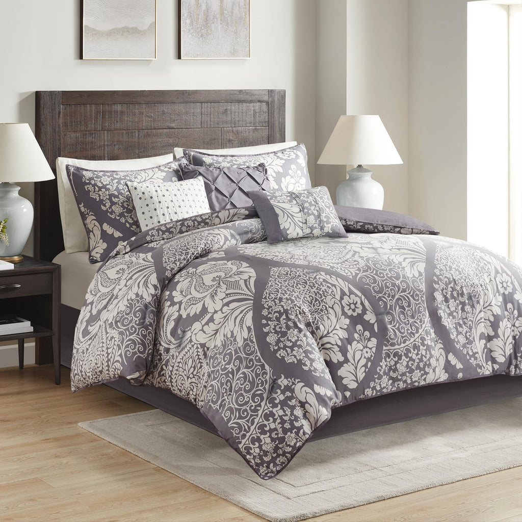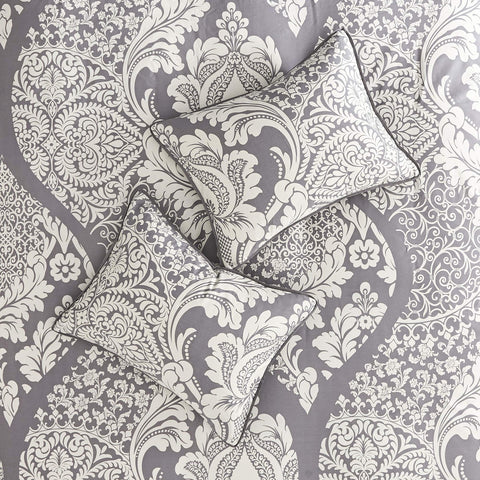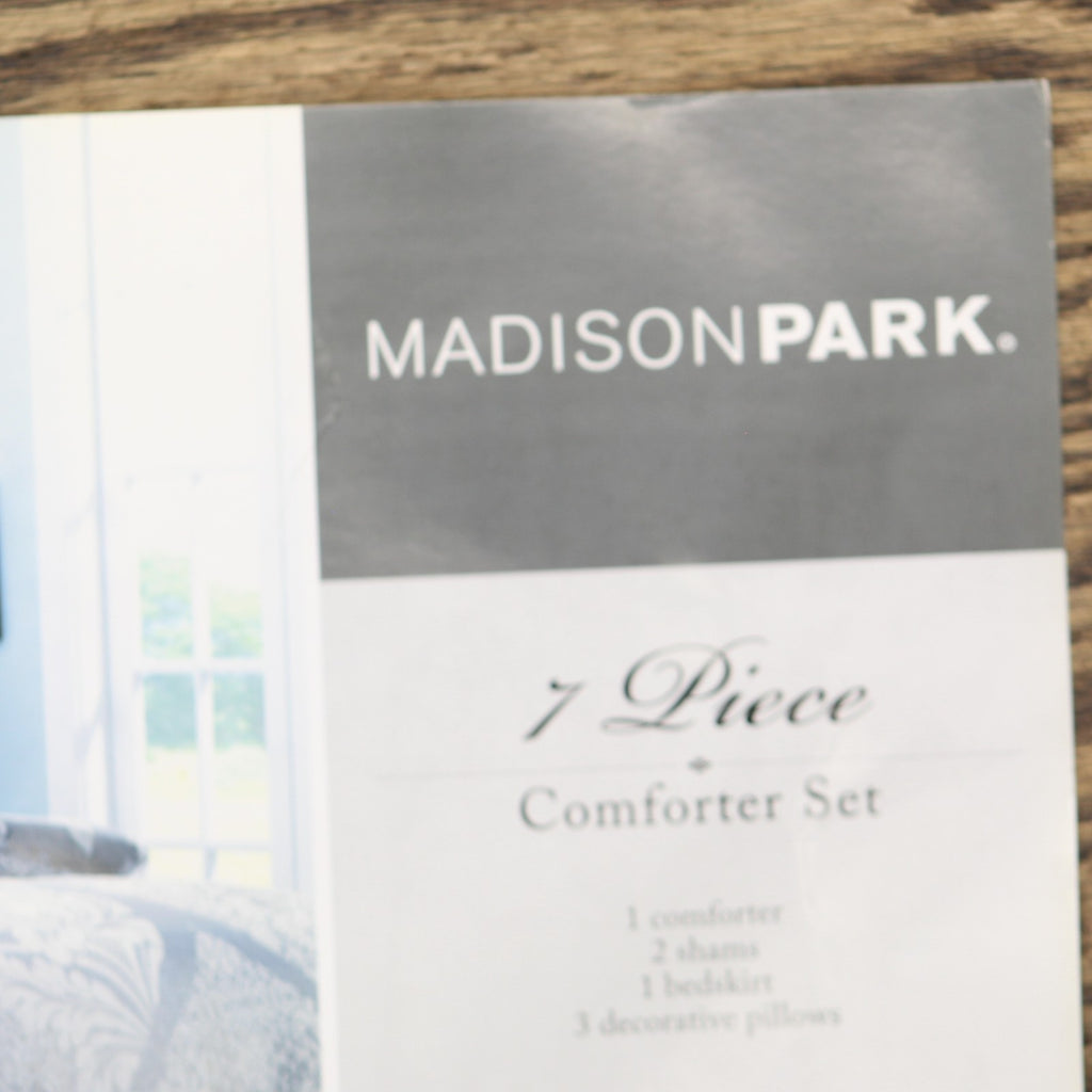 The Madison Park Vienna 7 Piece Cotton Printed Comforter Set offers an eye-catching update to your bedroom décor. A beautifully intricate damask pattern is flaunted across the comforter and shams, for a chic transitional look. Cotton cover is Oeko-Tex certified to be free of any chemicals and harmful substance paired with hypoallergenic filling for a perfect all season bedding. Set includes: 1 Comforter: 90"W x 90"L, 1 Bed Skirt: 60"W x 80"L + 15"D, 3 Pillows: 18"W x 18"L/16"W x 16"L/12"W x 16"L, 2 Standard Shams: 20"W x 26"L + 2"D Care instructions: machine washable