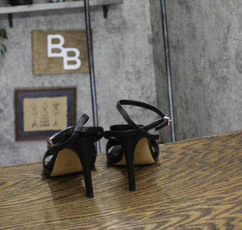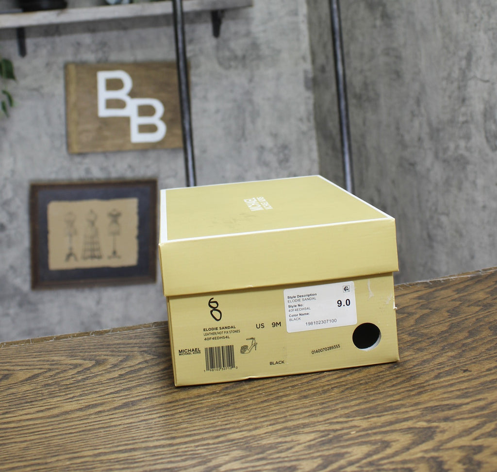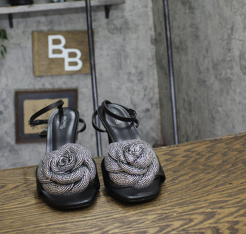 Bigtime rhinestone blooms add undeniable style to the lofty look of the Elodie dress sandals from MICHAEL Michael Kors. Features Stiletto heel: 3-1/2" Square toe Signature adjustable buckle closure 3D rhinestone rosette at vamp Upper: leather; lining: manmade; sole: rubber Imported