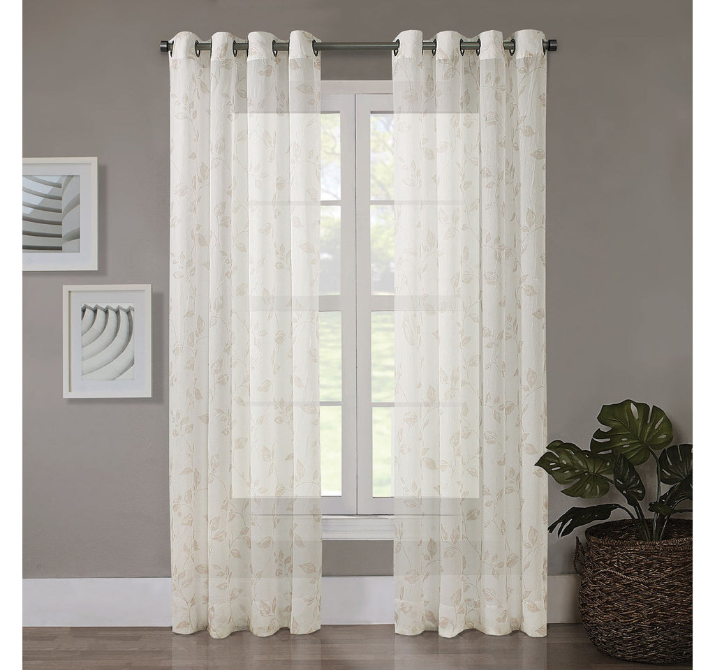Leave Printed Crushed Voile features voile fabric with leave pattern and a crinkle texture on the surface. The leave design is simple but classic and enhances the elegant look of your window. Number of Panels: 1 Included: 1 Panel(s) Top Construction: Grommet Top Opening: 1 1/2 In Grommet Open Use: Indoor Fiber Content: 100% Polyester Fabric Description: Voile Lining: Unlined Light Filtration: Sheer Care: Machine Wash Curtain Length: 84 Inch Curtain Width: 50 Inch Grommet