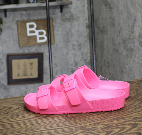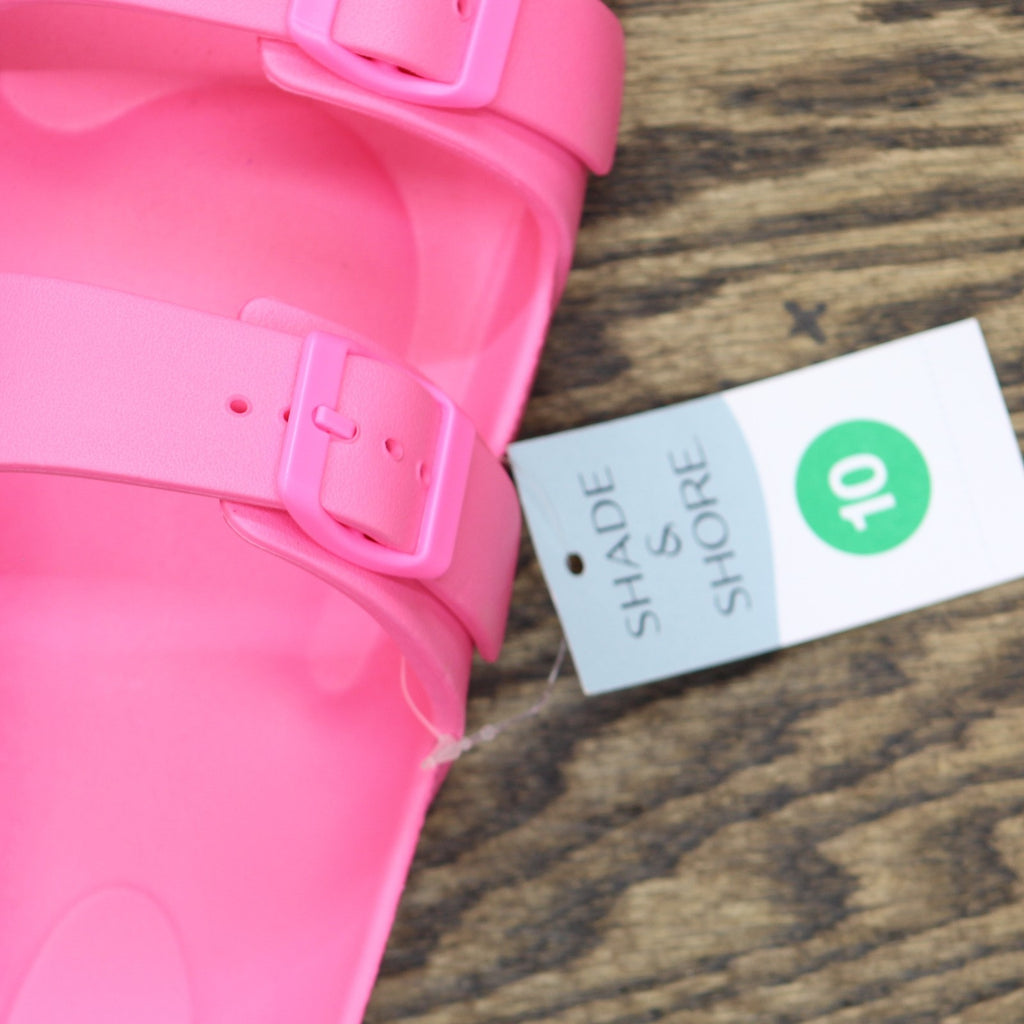 Update your summer wardrobe with the cool and casual look of these comfy Neida EVA Two-Band Slide Sandals from Shade & Shore. These simple yet stylish slip-on sandals feature 100% plastic construction for a squishy feel underfoot and a surface that easily wipes clean. Great for wearing in your garden, on your deck or even to the pool, these open-toe sandals feature a double band on top with two buckles, all in a single color for a chic twist on a classic design. Slip-on sandals make a casual summer staple Plastic construction with allover single color for a sharp look Open-toe and -back offer a breezy fit to keep feet cool Great for gardening, errands or simply hanging in your yard Sizing: Womens Care and Cleaning: Spot or Wipe Clean Footwear Lining Material: 0% No Lining Construction: Double Straps, Contoured Footbed Footwear Insole Material: 100% EVA (Ethylene Vinyl Acetate) Features: Slip On Toe Style: Almond Toe Footwear Upper Material: 100% EVA (Ethylene Vinyl Acetate) Footwear Outsole Material: 100% EVA (Ethylene Vinyl Acetate) Heel: No Heel Shoe Width: Medium Footwear toe openness: Open Toe Footwear outsole details: Textured Outsole Battery: No Battery Used