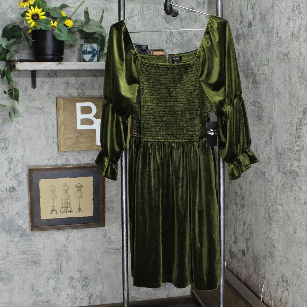 Tahari Asl's elegant velvet dress combines a stylish square neckline with dramatically ruched puff-shoulder sleeves.