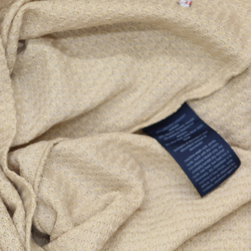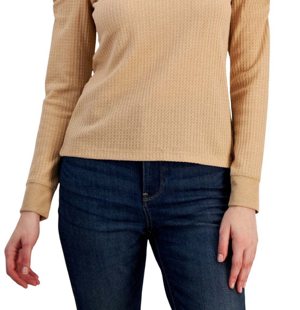 Explore the glam size of cozy with this stunning look from Tommy Hilfiger, a waffled shirt with metallic accents and sleek cold shoulders.