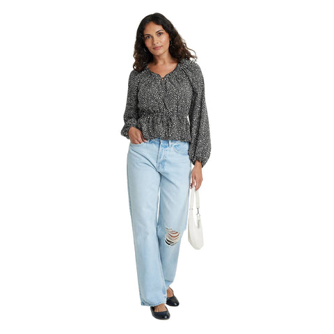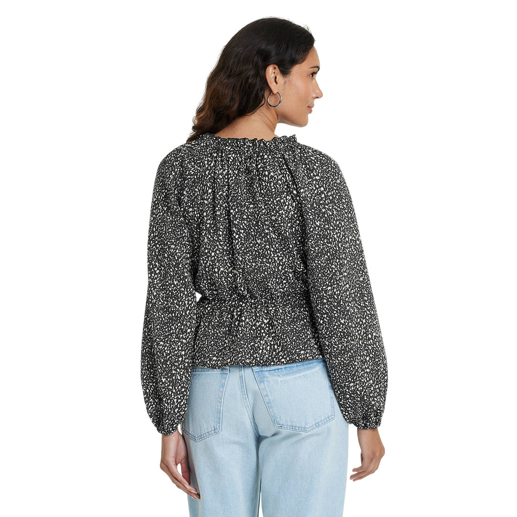 Add an on-trend piece to your everyday wear with this Balloon Long-Sleeve Blouse from Universal Thread. This blouse fashioned in a fitted silhouette features a ruffled crew neckline, tied detailing at the waist and balloon long sleeves for fashion-forward flair. Universal Thread balloon long-sleeve tee Recycled polyester fabric Fitted silhouette Tied closure at waist Pullover Sizing: Womens Material: 100% Recycled Polyester Fit: Fitted Length: Below Waist Garment Style: Long Sleeve, Pullover Fabric Name: Woven Neckline: Crew Garment Details: No Pocket Fabric Weight Type: Lightweight Fabric Garment sleeve style: Balloon Sleeve Care and Cleaning: Machine Wash, Tumble Dry