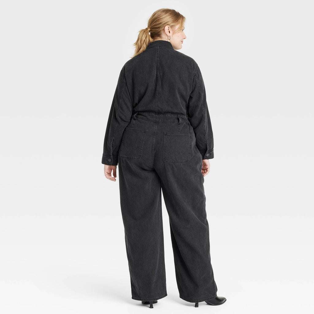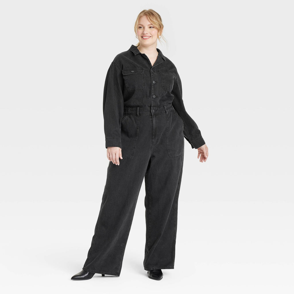 Embrace laid-back style with this Long-Sleeve Utility Baggy Denim Jumpsuit from Universal Thread. Made of cotton and lyocell, this long-sleeve jumpsuit features a collared neckline with button-down style. This straight-leg jumpsuit comes with a fly button and zipper for a snug, stay-put fit. Designed with barrel cuffs, this jumpsuit sports two front pockets, two side pockets and two back pockets. Universal Thread baggy denim utility jumpsuit Made of recycled cotton Collared neckline with front half-length button Long sleeves and barrel cuffs Fly button and zipper 6 pockets, belt loops Fair Trade certified Sizing: Womens Plus Material: 40% Cotton, 40% Lyocell, 20% Recycled Cotton Garment Length: Full Closure Style: Fly Button and Zipper Hem Style: Plain Hem Inseam Length: 31 Inches Fit: Straight Leg Fabric Name: Woven, Denim Garment Style: Long Sleeve, Front Half Length Zipper, Front Half Length Button Neckline: Collared Cuff Type: Barrel Cuff Garment Details: Slash Pocket, Side Pocket, Belt Loops, Patch Pocket, Flap Pocket, Back Pocket, Back Darts, Front Pocket, Front Placket, Buttons, Black Wash Industry or Government Certifications: OEKO-TEX STANDARD 100, Fair Trade Certified Garment back type: Plain Fabric Weight Type: Midweight Fabric UPF rating: No UPF Rating Garment sleeve style: Basic Sleeve OEKO-TEX Institution: HOHENSTEIN HTTI OEKO-TEX Certification Number: 24.HHK.35879 Care and Cleaning: Machine Wash, Tumble Dry