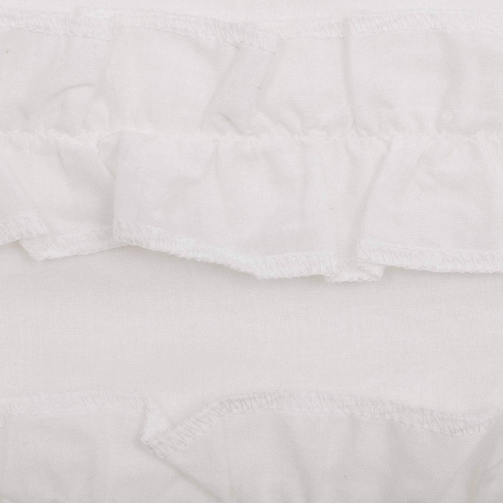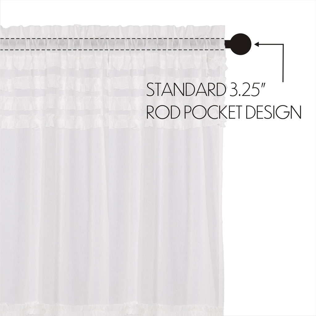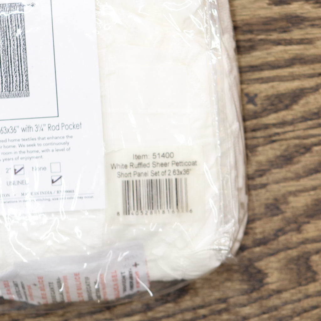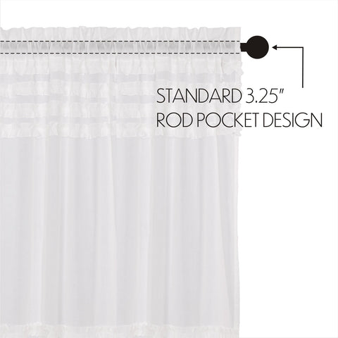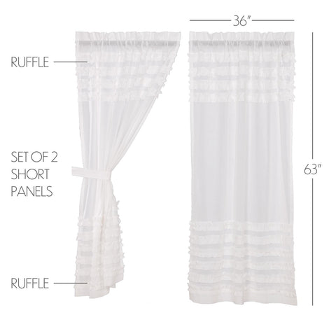 Includes 2 panels. RUFFLED FARMHOUSE CURTAINS: Includes two delicately ruffled 63 by 36 inch curtains crafted in a sheer, lightweight cambric made from 100% cotton. Features rod pocket for easy hanging and matching tie backs. LIGHT FILTERING: Unlined, closely woven fabric gently lets in light while providing a little extra privacy. MODERN FARMHOUSE FLAIR: Versatile styling sure to match country chic, farmhouse, or cottage decor. EASY CARE: Machine wash on gentle and tumble dry on low. Iron safe. Rod pocket for easy hanging. LAYERED RUFFLES: Layers of sheer, ruffled fabric create a soft, romantic look.