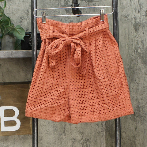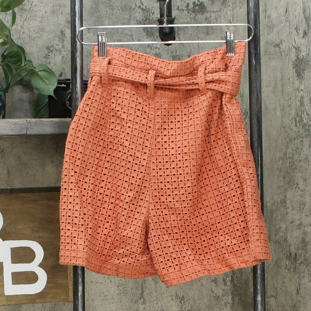 Take your casualwear to the next level with these Coral High-Rise Eyelet Paperbag Shorts from A New Day. These coral paperbag shorts with allover eyelet details make a chic choice in your casual wardrobe. Cut to a flattering high-waisted fit from a breathable fabric, they're perfectly comfortable to wear on warmer days. The fly zipper closure along with a matching tie belt around the waist helps to provide you a secure fit, while the side inner pockets add a dash of functional style. Pair with everything from simple tees to printed blouses to create a fresh look.