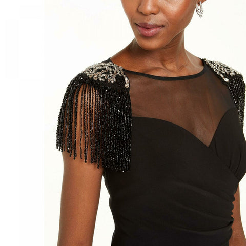 Beaded embellishment and fringe at shoulder