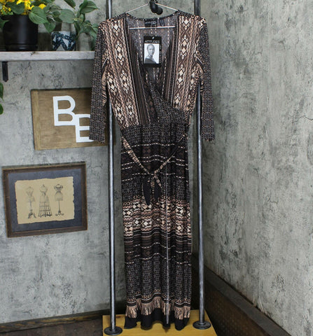 Features: 3/4-length sleeves, V-neckline, printed, belt