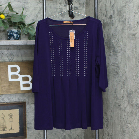 Add some sparkle to your style with Belldini's plus size top, a flattering 3/4-sleeve design accented by glamorous rhinestones and polished pleats.