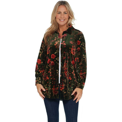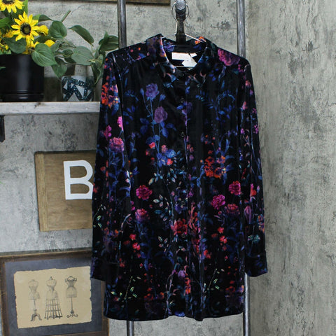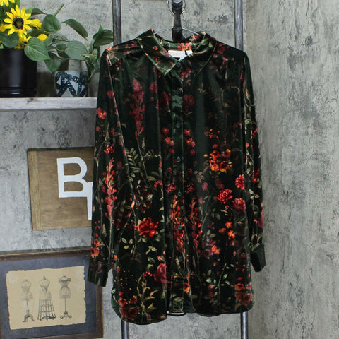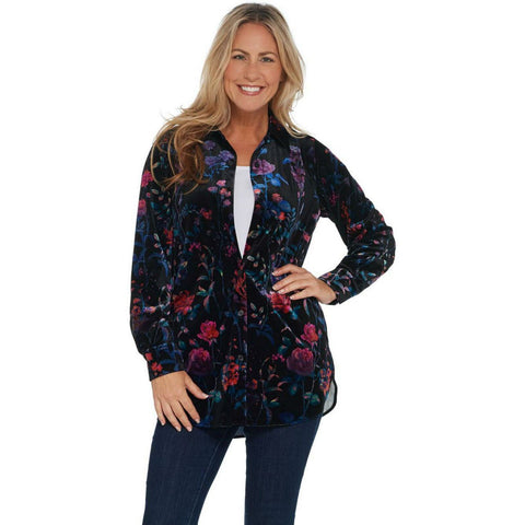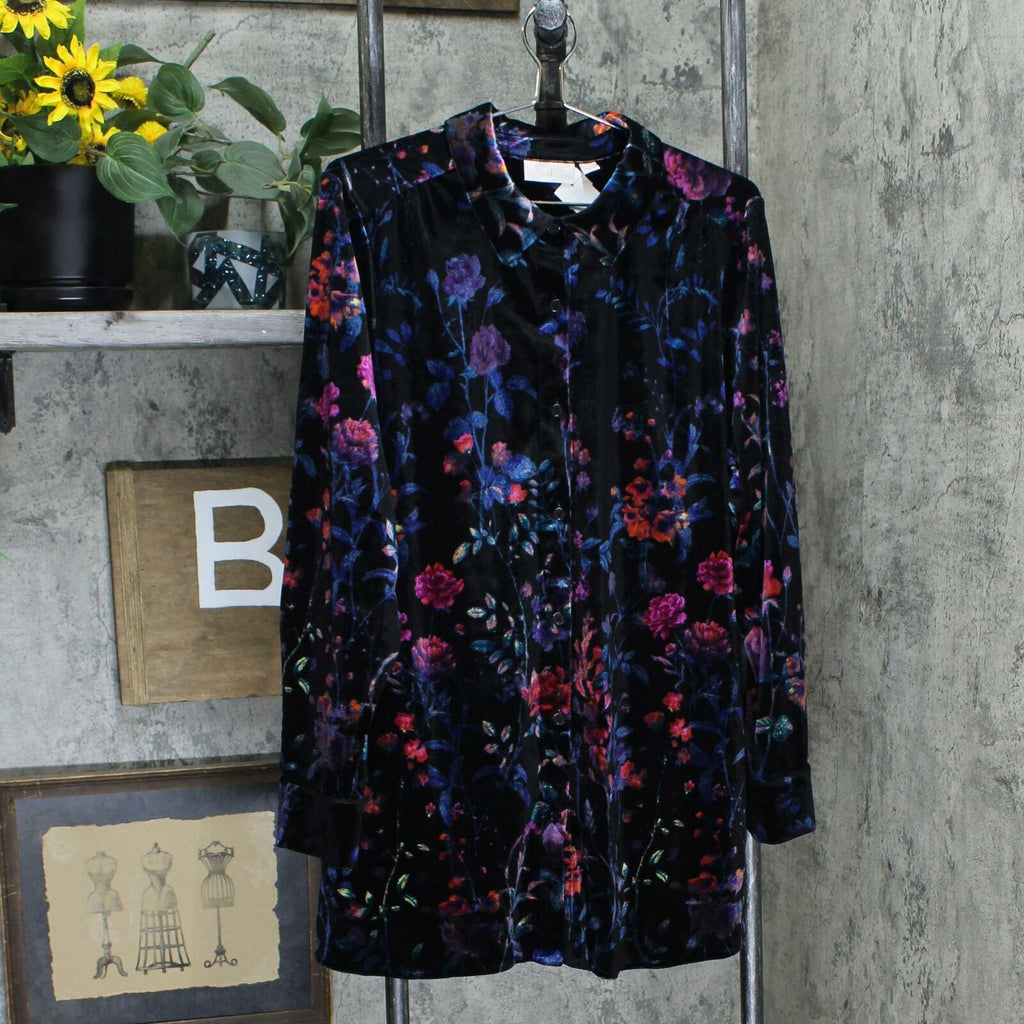 Features: shirt collar, floral print, side seam pocket, long sleeves with open slits at cuffs