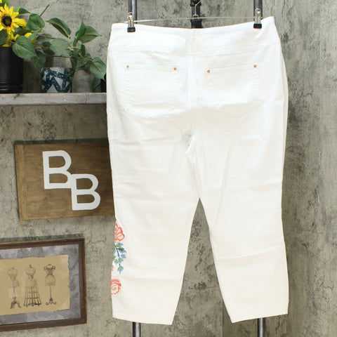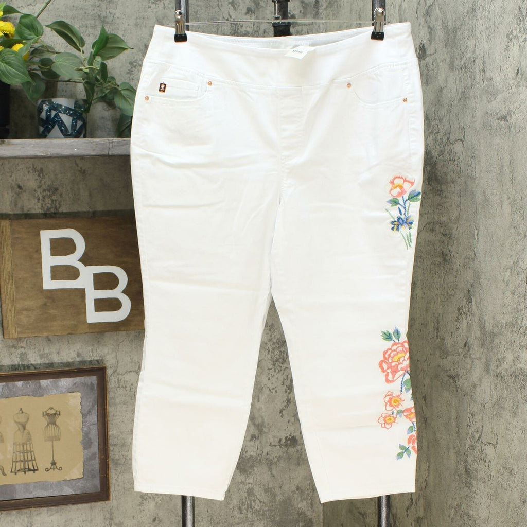 Features: pull-on style, faux fly detail, five pockets, floral embroidery, cropped length