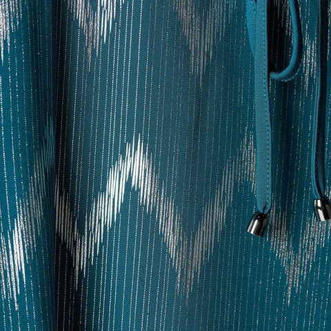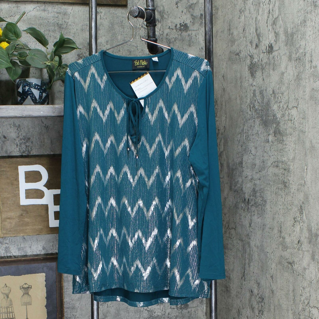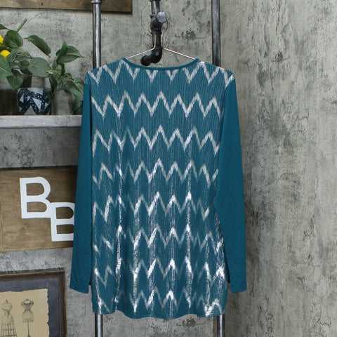 Features: heat-sealed chevron front and back pattern, solid-colored long sleeves, round neckline, hi-low hem, center front tie keyhole