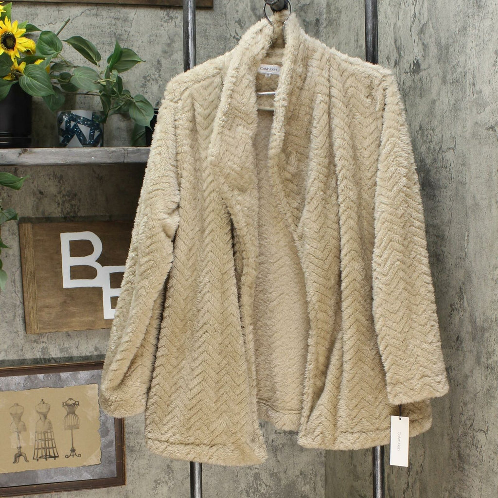 Cozy is key with Calvin Klein's snuggly cardigan stitched in a modern chevron pattern.