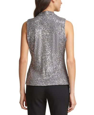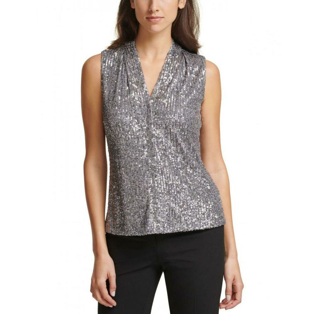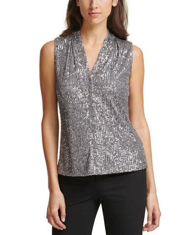 Shiny and professional, this top from Calvin Klein features eye-catching sequins for a bold look and is gathered at the shoulders for a more streamlined finished.