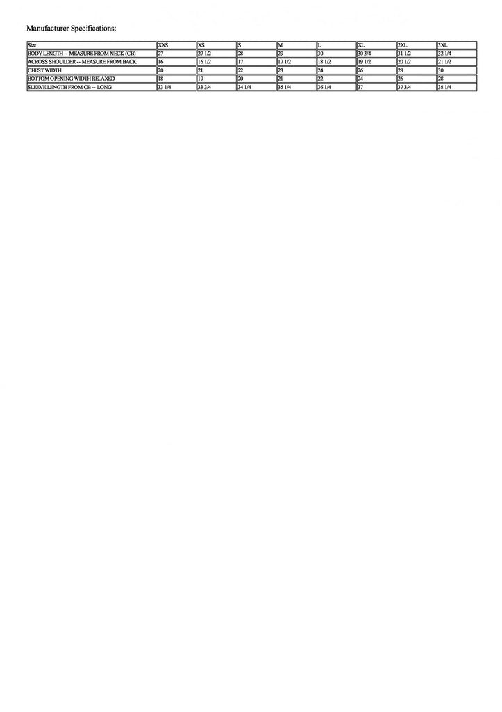 | BODY LENGTH -- MEASURE FROM NECK (CB) | 27 | 27 1/2 | 28 | 29 | 30 | 30 3/4 | 31 1/2 | 32 1/4 |