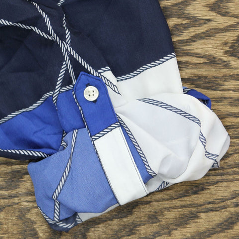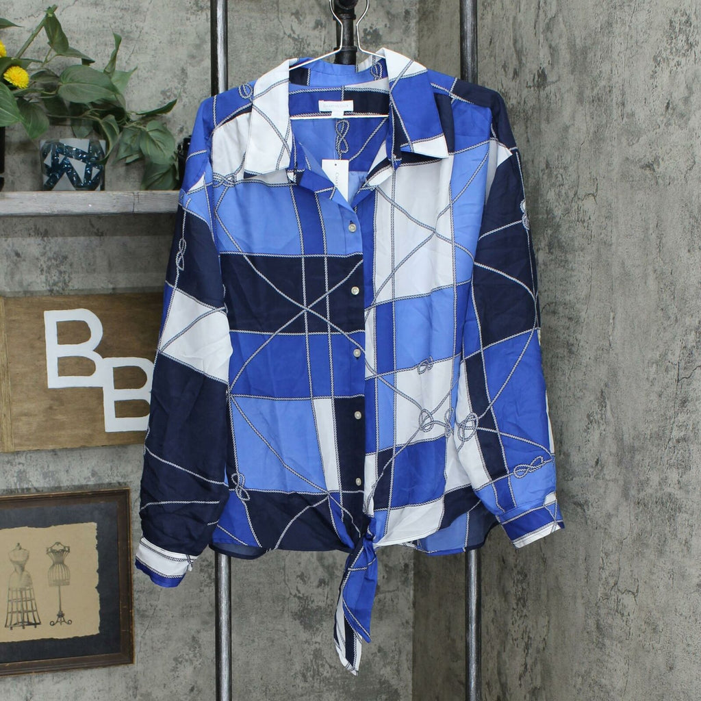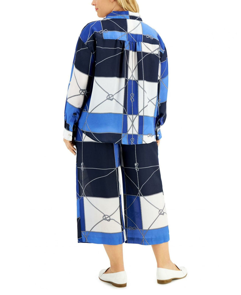 Add a nautical nod to your wardrobe with this chic Charter Club top, a plus size pick finished with a playful print and versatile styling, like a button front and roll-tab sleeves.