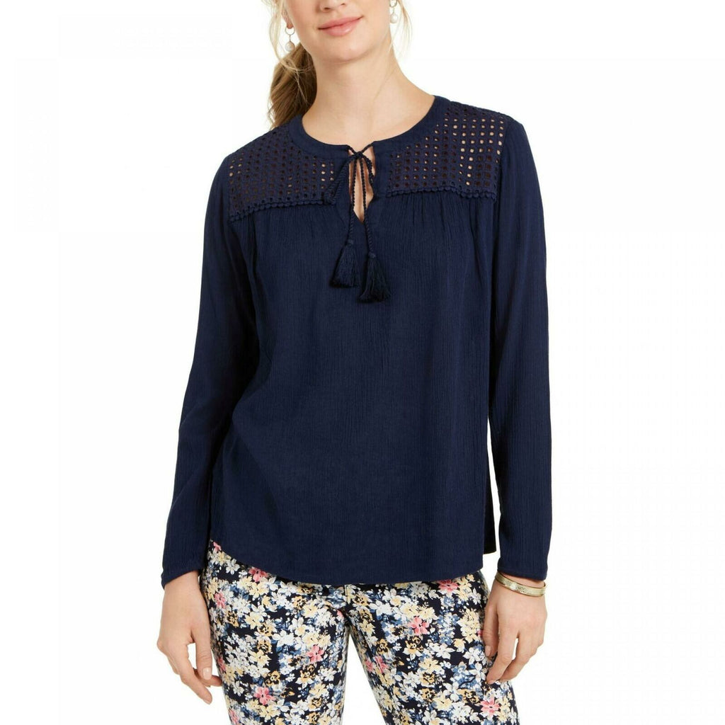 Charter Club makes sophisticated flair look breezy and effortless in this eyelet-yoke top with tassel ties at the neckline.