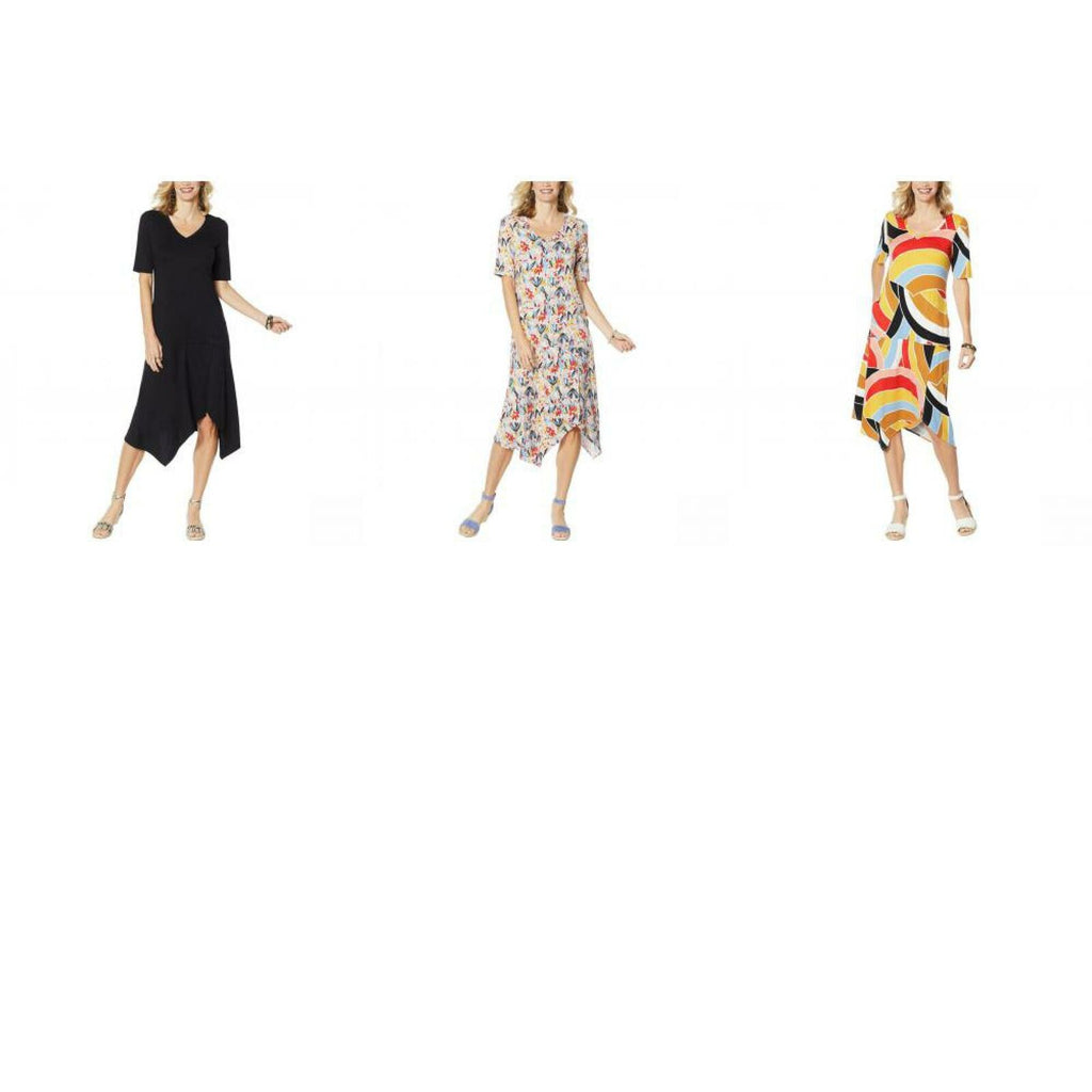 Comfort and style go hand-in-hand with Comfort Code by Cuddl Duds. A drop waist, elbow-length sleeves and an asymmetric, handkerchief hem add figure-flattering style to your everyday look.