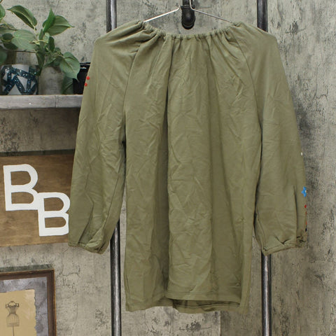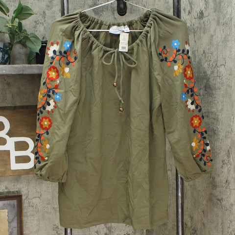 Features: tie front detail, 3/4-length sleeves with elastic at opening, floral embroidery, straight hem