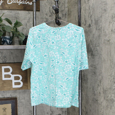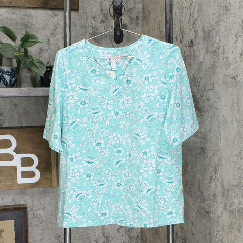 Features: floral print, elbow-length sleeves, V-neckline, straight hem