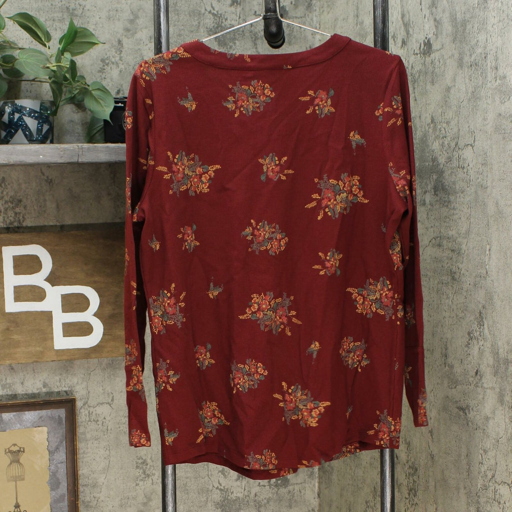 Features: print, V-neck, henley style with button details, long sleeves, curved hem