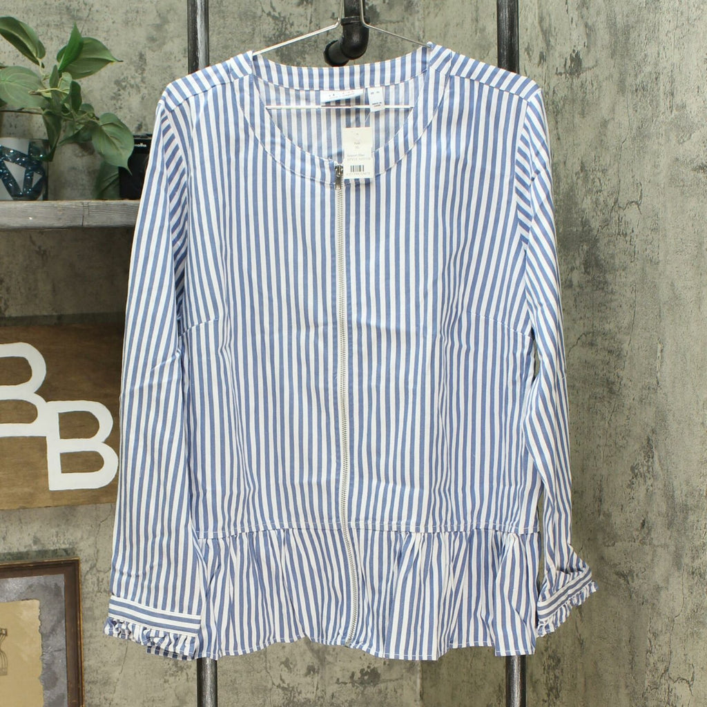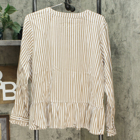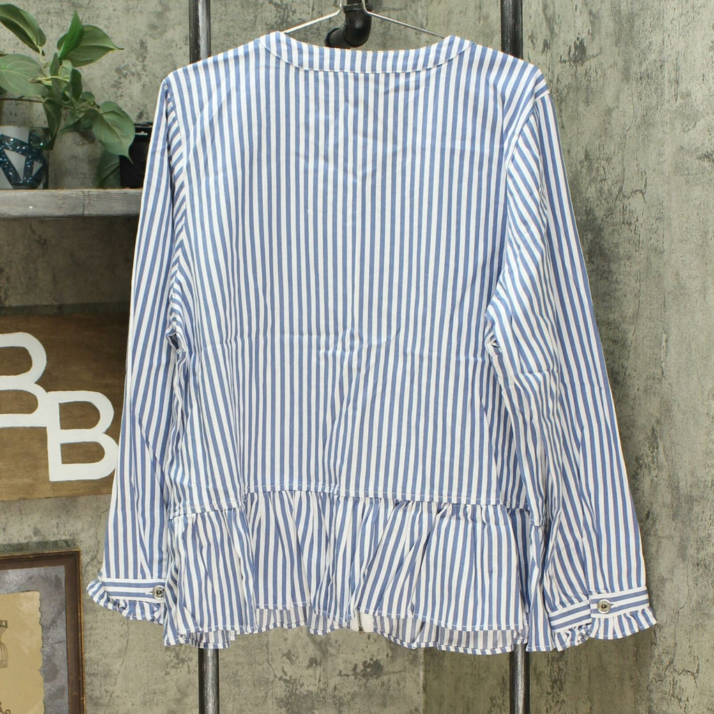 Features: yarn-dyed stripe, long sleeves, scoop neckline, ruffle cuff with back vent, bottom shirred peplum hem