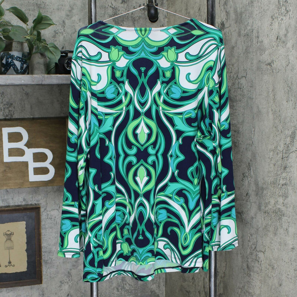 Features: allover print, scoop neckline with front keyhole, long sleeves with slit on flared cuffs, straight bottom hem