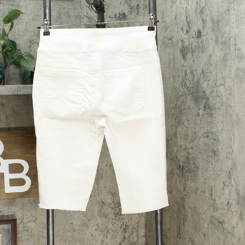A frayed hem gives these denim Bermuda shorts a cut-off look that's right on trend. But the best part may be the wide, stretch waistband offering all-day comfort.