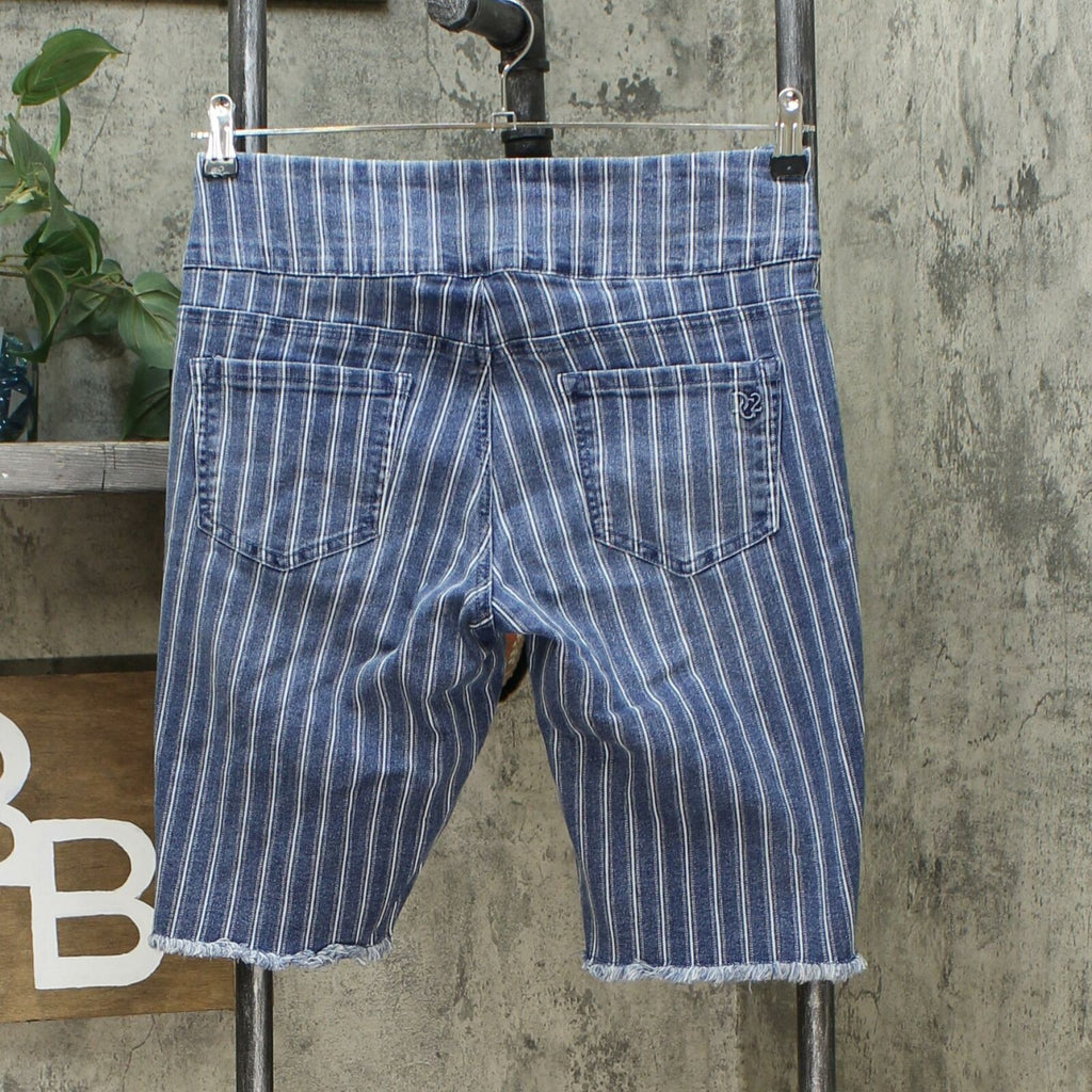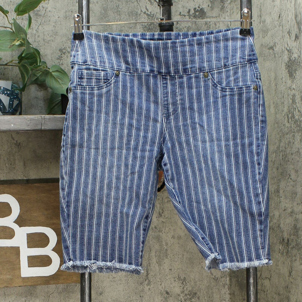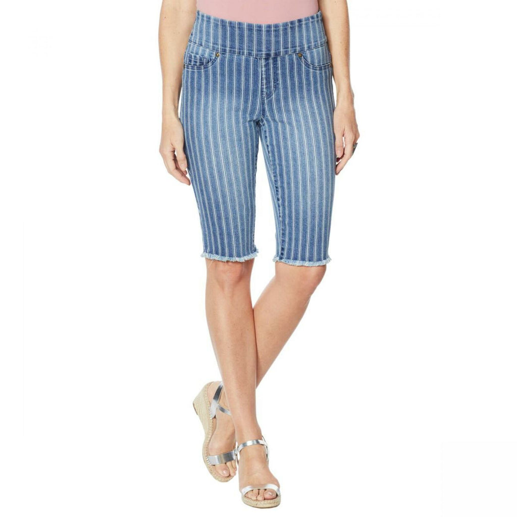 A frayed hem gives these denim Bermuda shorts a cut-off look that's right on trend. But the best part may be the wide, stretch waistband offering all-day comfort.