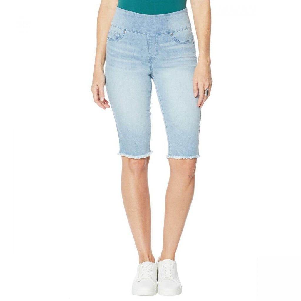 A frayed hem gives these denim Bermuda shorts a cut-off look that's right on trend. But the best part may be the wide, stretch waistband offering all-day comfort.
